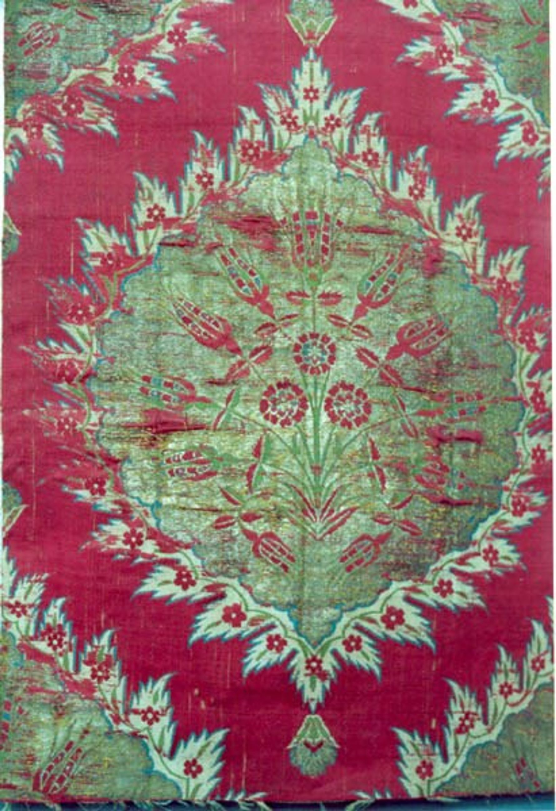 Deux fragments de lampas collés sur papier, fond de satin rouge, grandes fleurs renfermant des bouquets de petites fleurs.