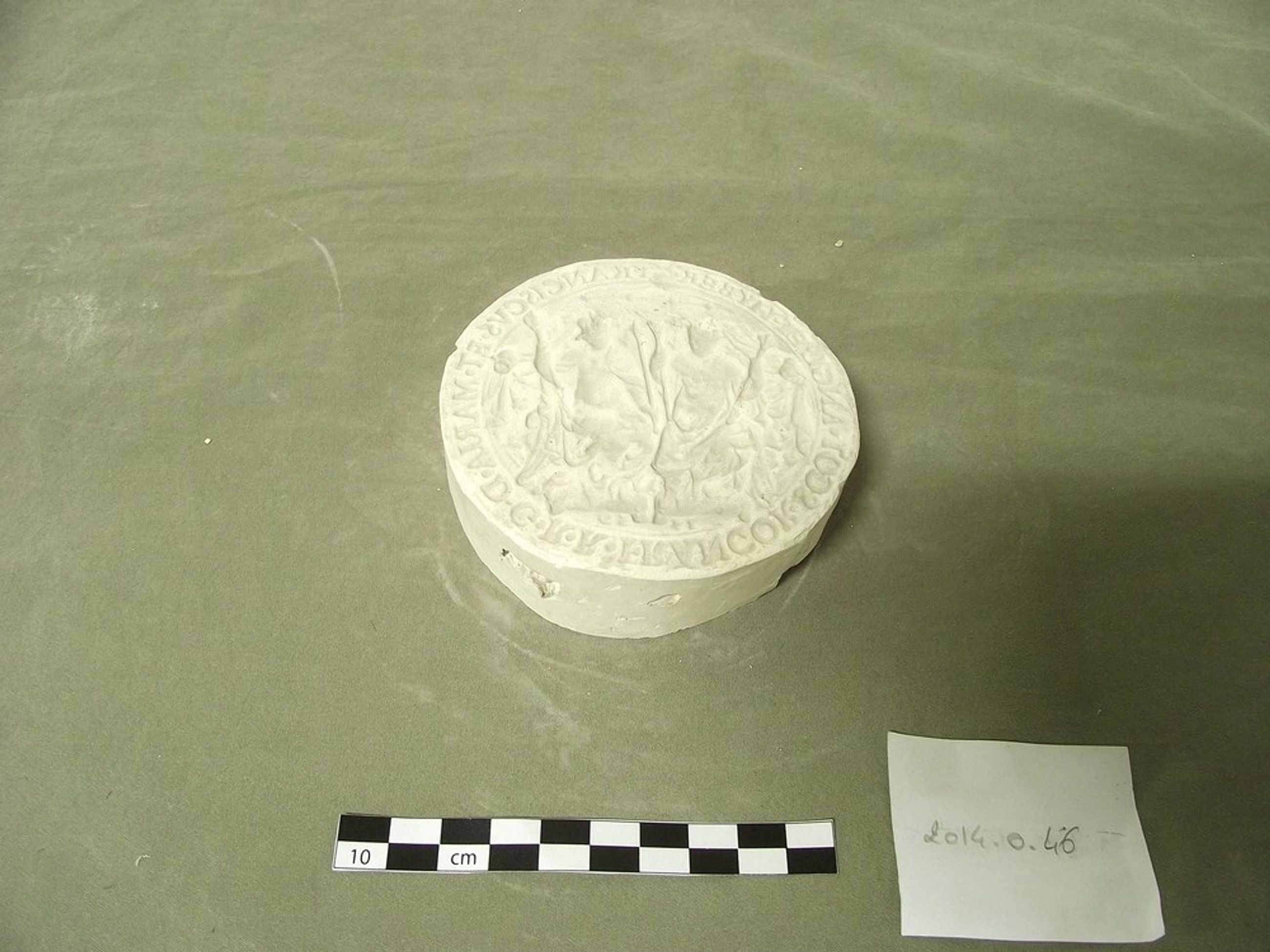 Moulage d'une matrice d'un sceau du XVIe, de François II et de Marie Stuart, 1559. Les deux personnages debout face à face, tenant chacun les insignes de leur royaume.