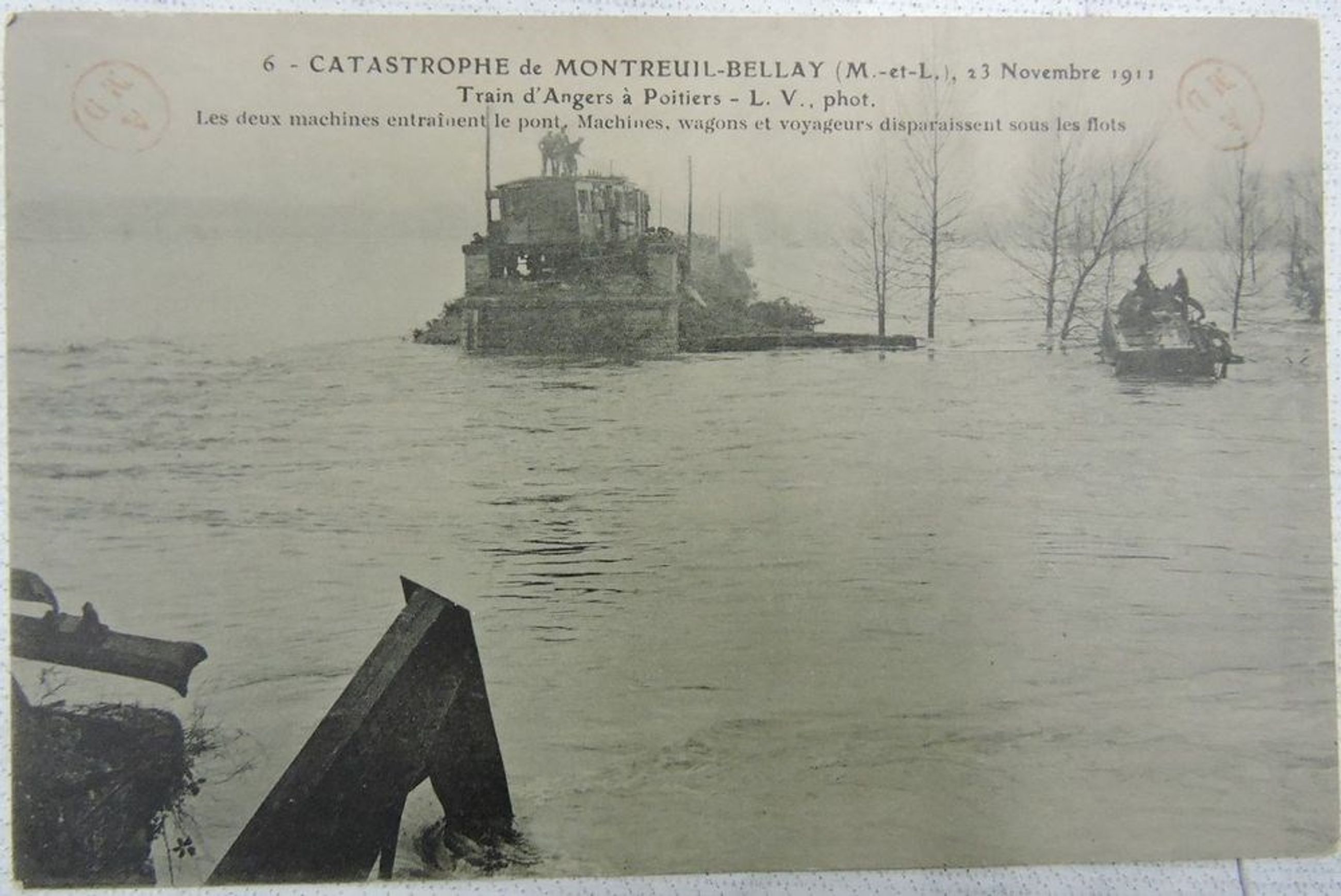 ; "6 - CATASTROPHE de MONTREUIL-BELLAY (M.-etL.), 23 Novembre 1911 // Train d'Angers à Poitiers - L. V., phot, // Les deux machines entraînent le pont, Machines, wagons et voyageurs disparaissent sous les flots"