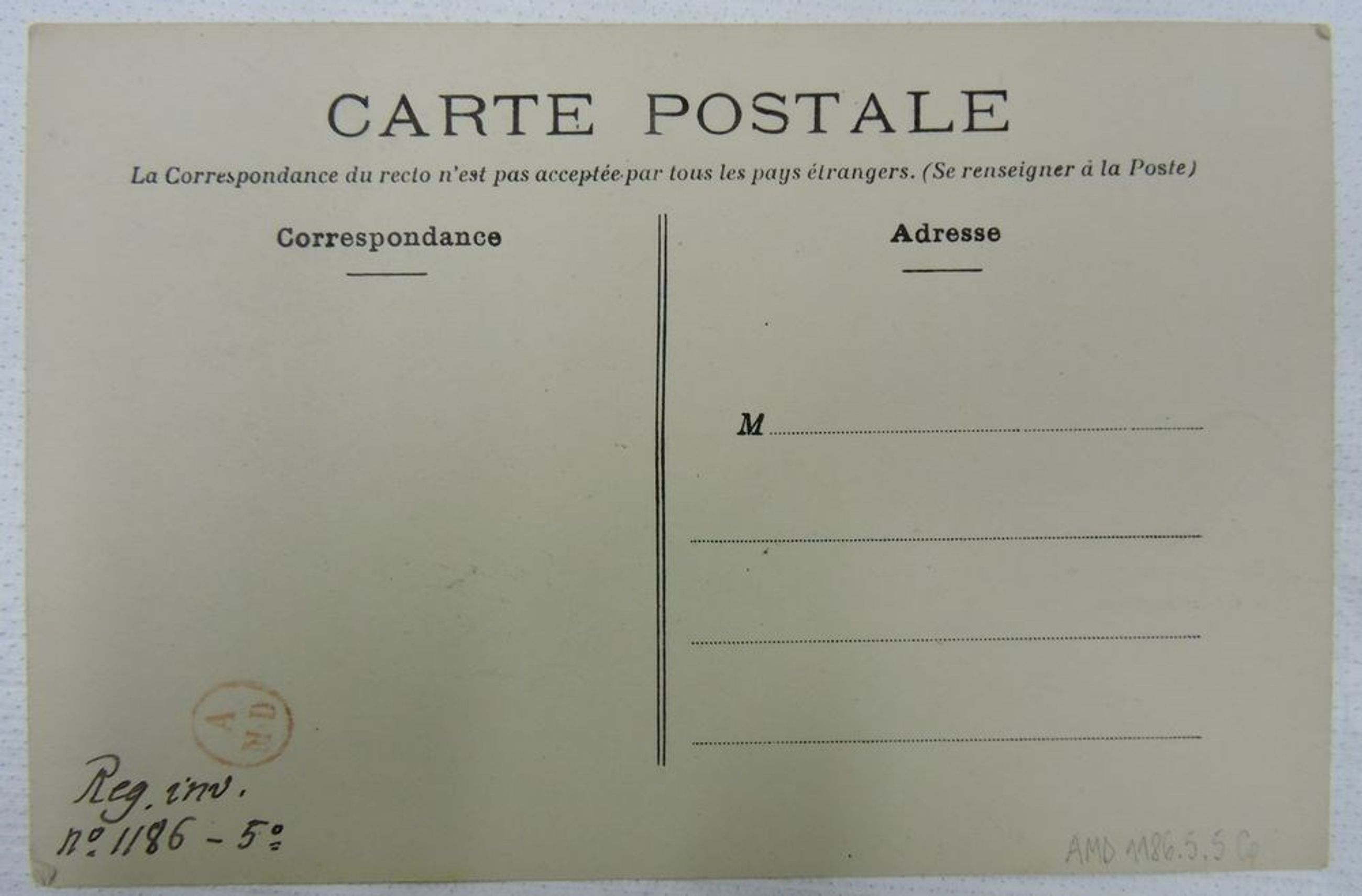 ; "CARTE POSTALE // La Correspondance du recto n'est pas acceptée par tous les pays étrangers. (Se renseigner à la Poste) // Correspondance Adresse // M"