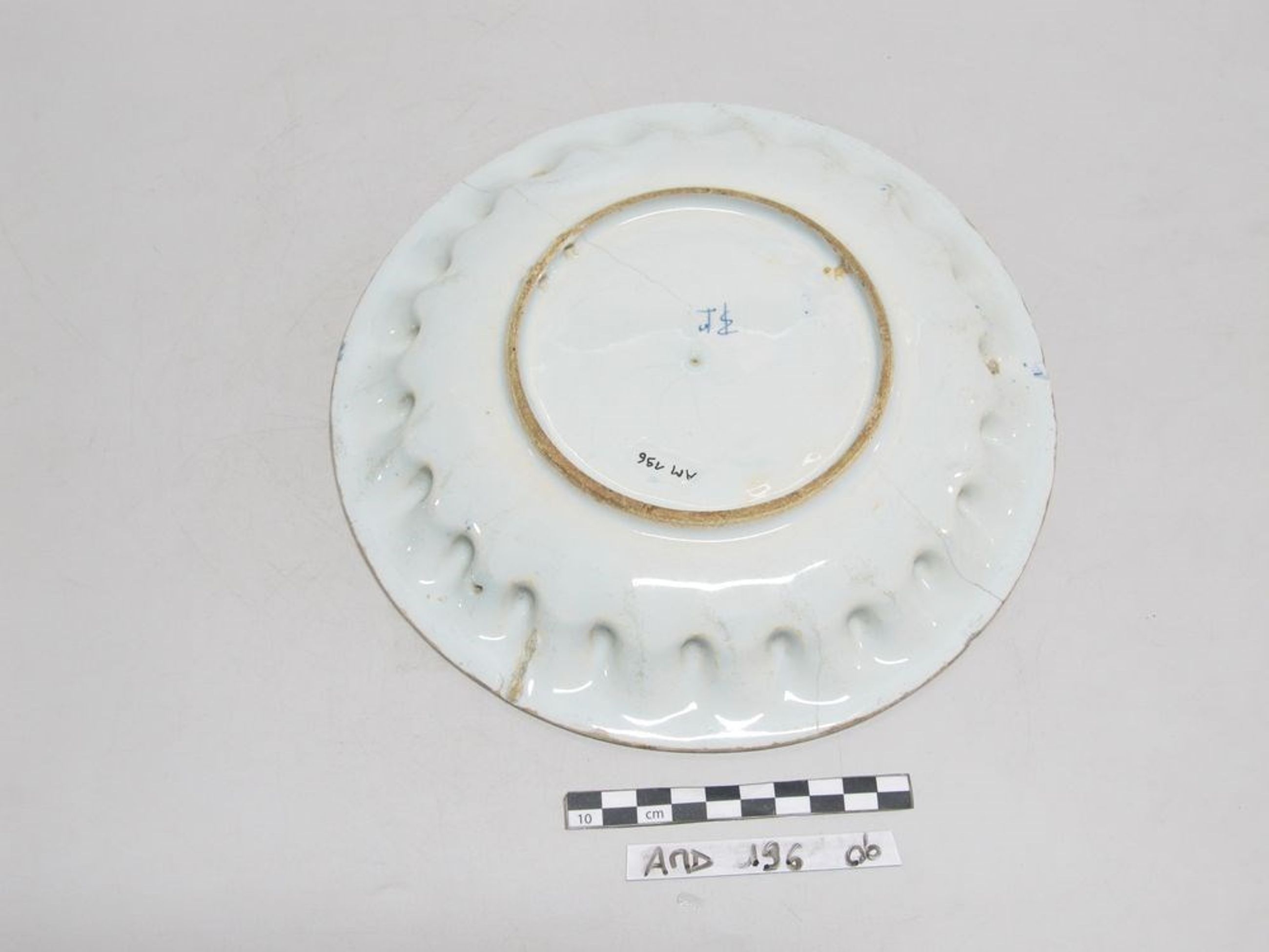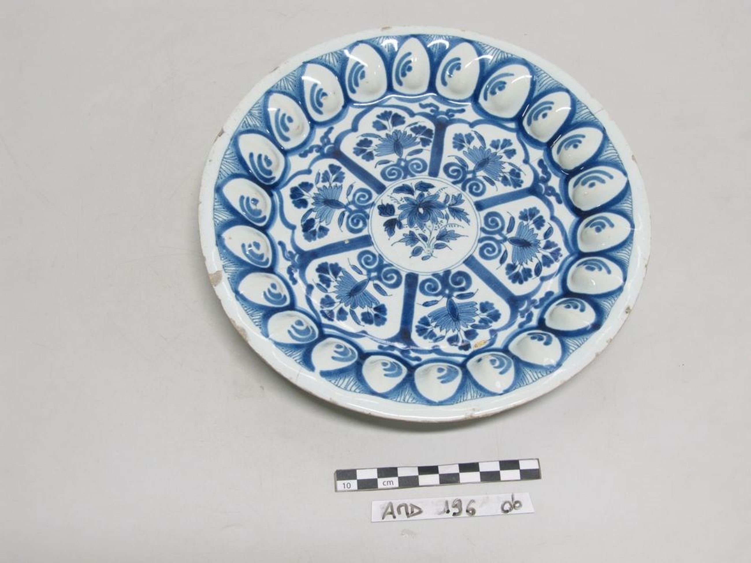 Plat rond en faïence bleutée et décor bleu. Marli godronné, rehaussé d'un filet bleu. Au centre, motif central floral entouré de six cartouches à décor fleuri. Fendue à plusieurs endroits.