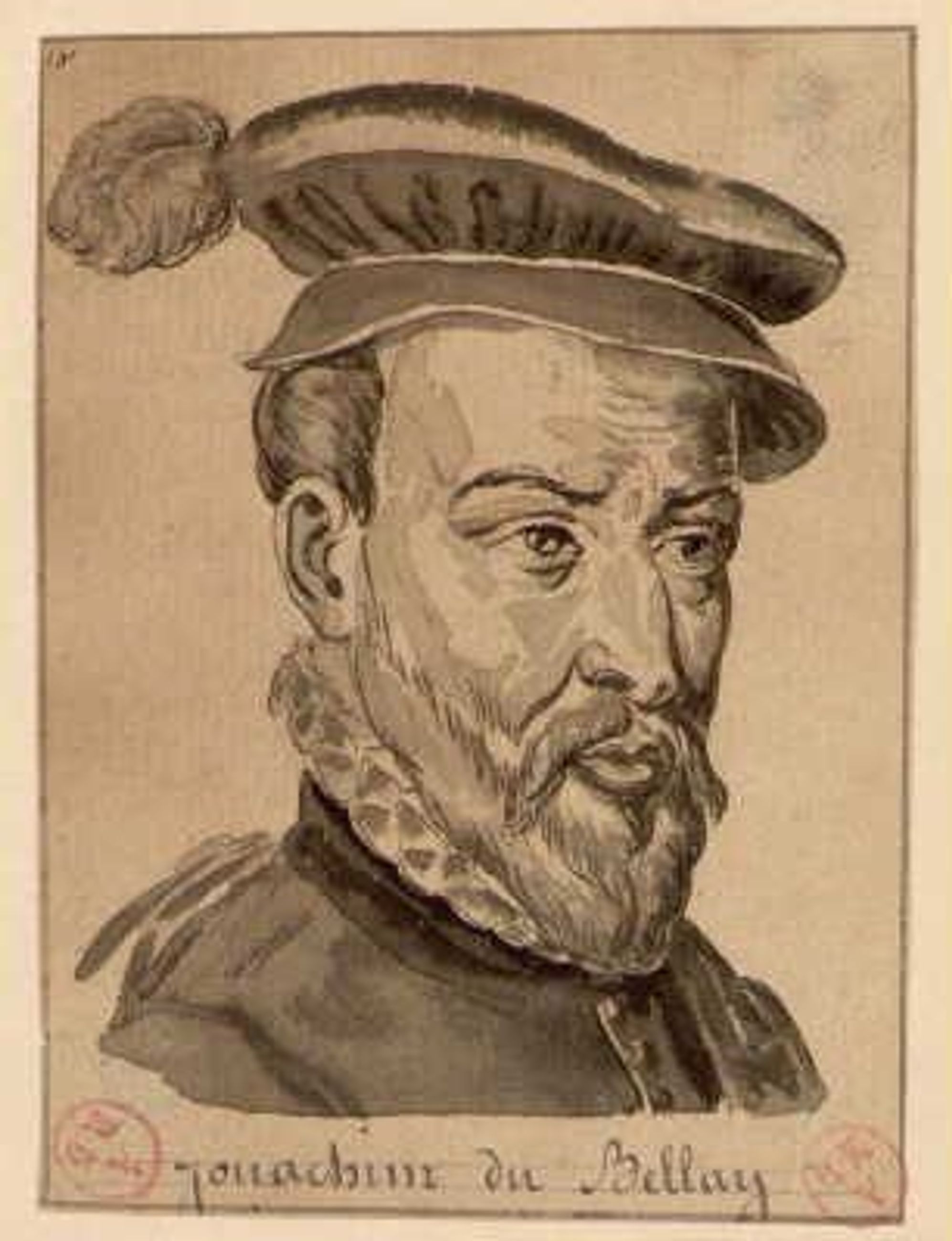 Deux portraits en buste représentent Joachim du bellay. Celui de gauche le figure tête nue, celui de gauche portant un chapeau d'époque renaissance.