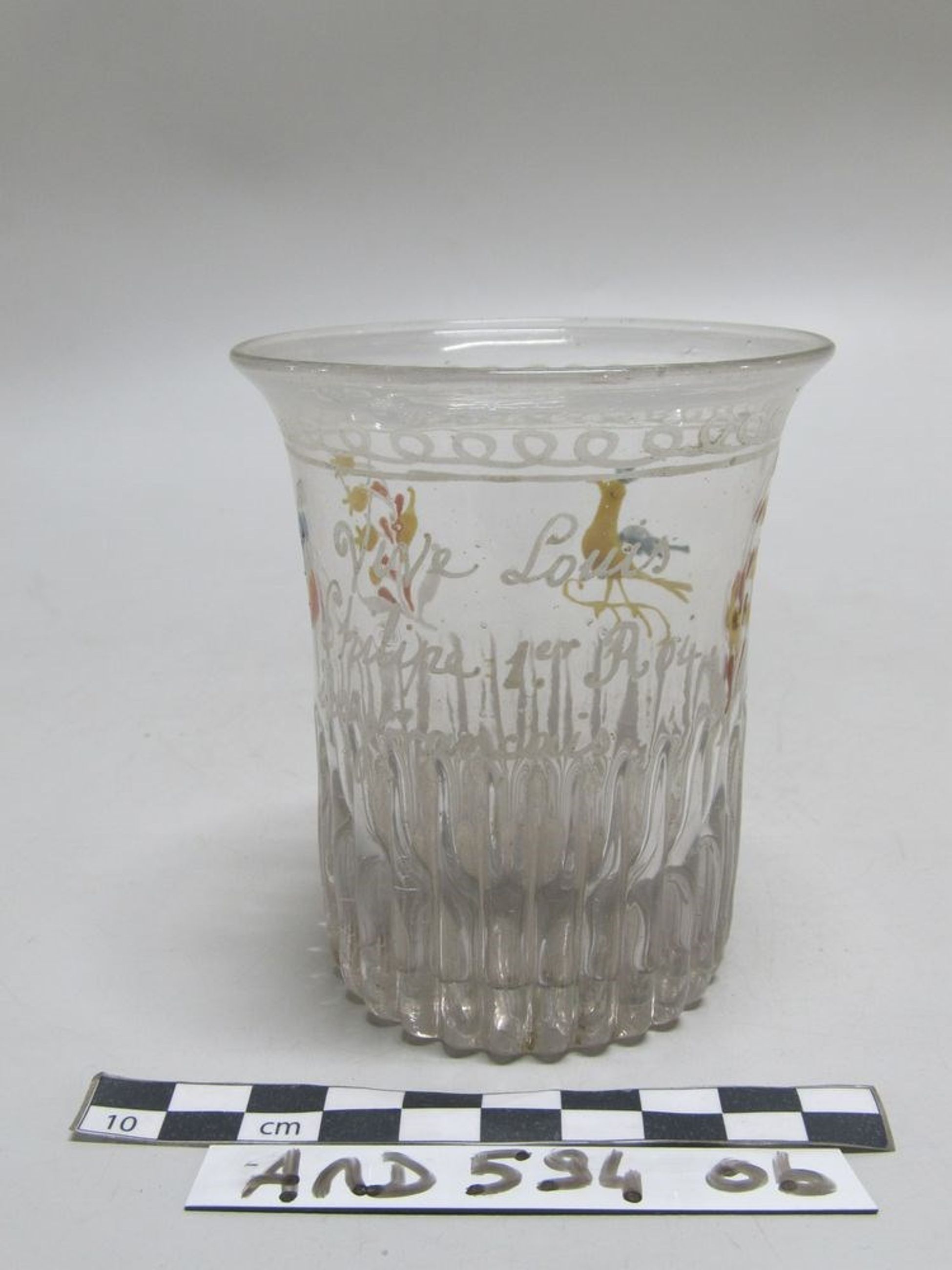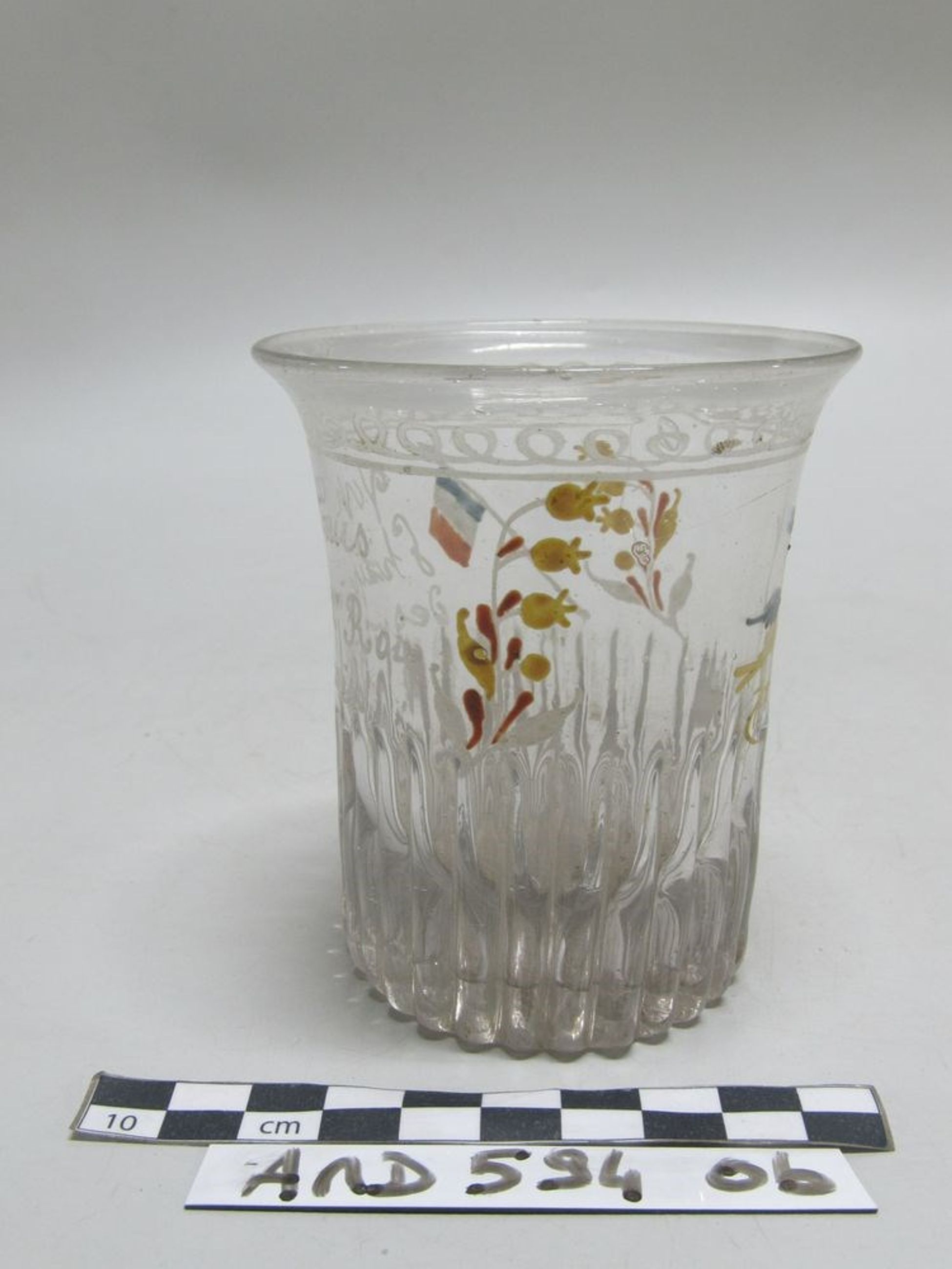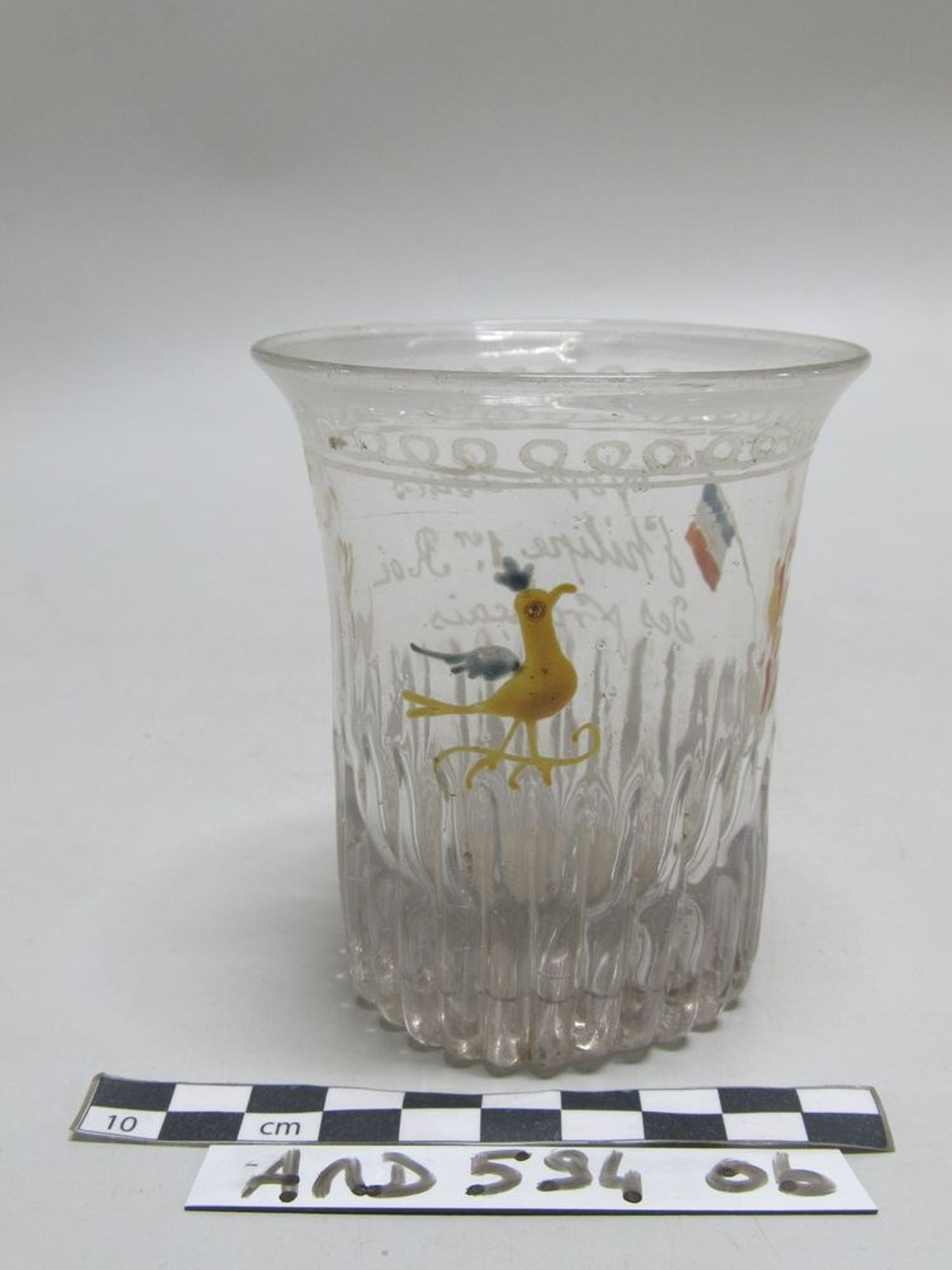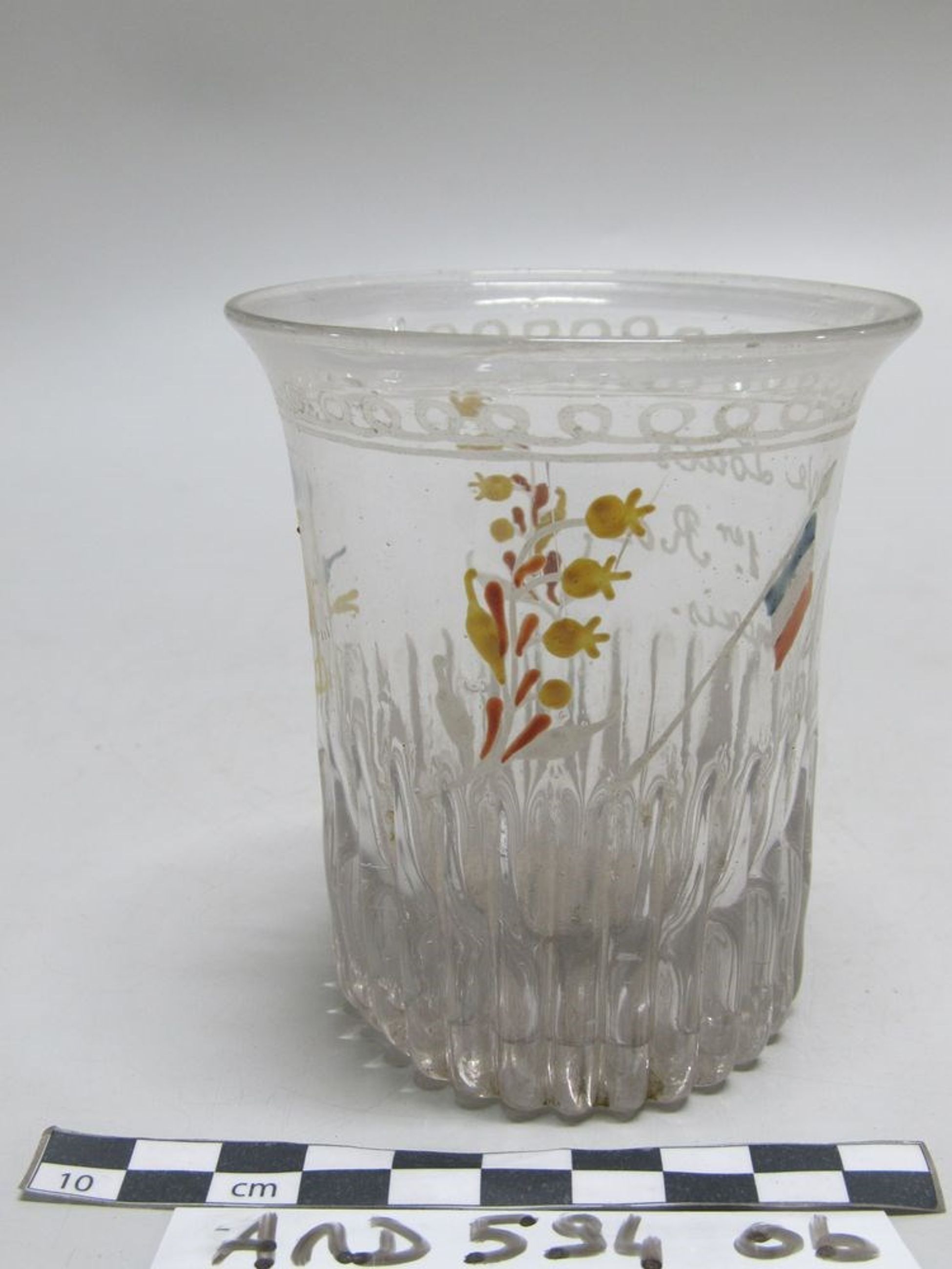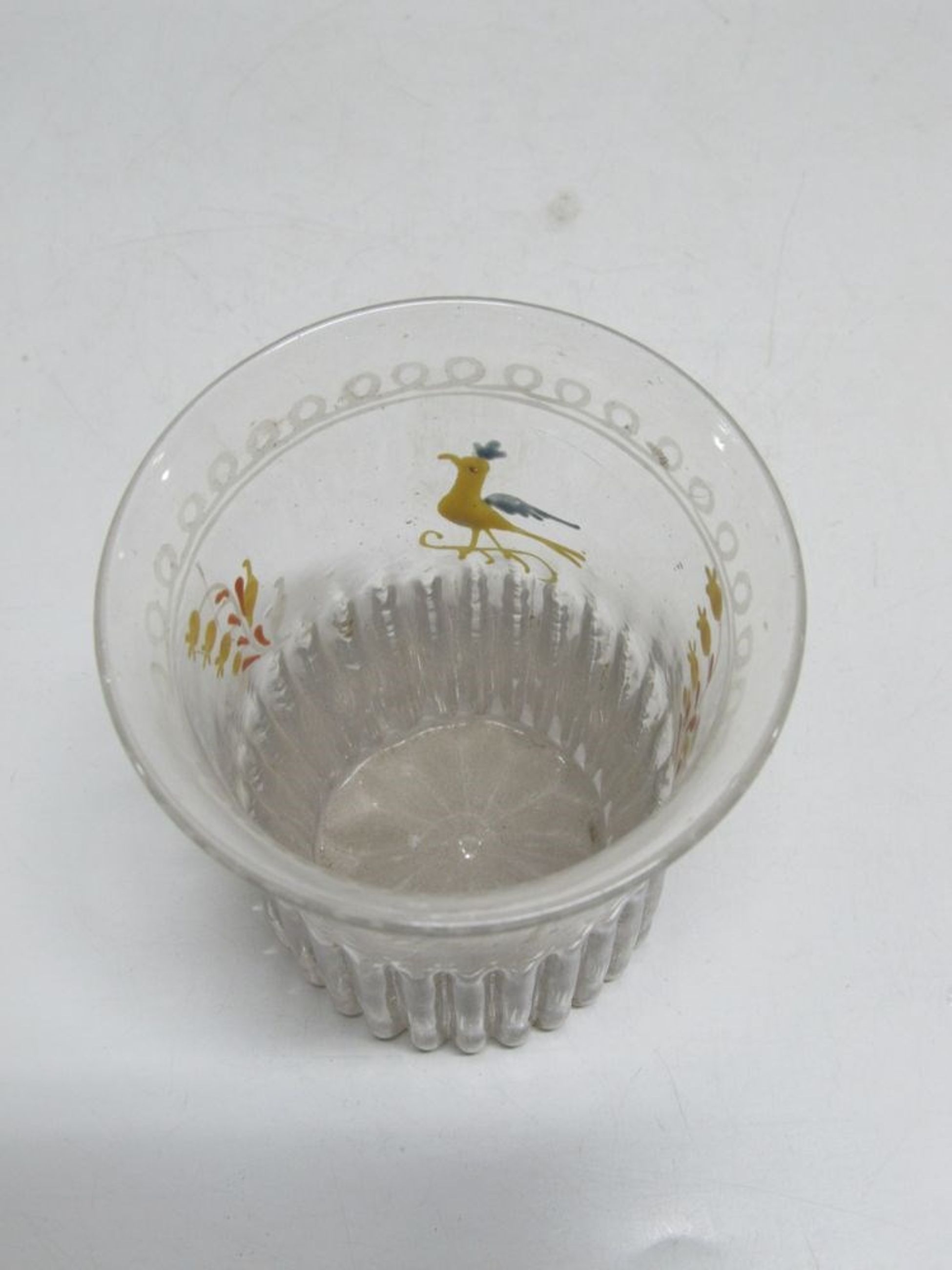 Verre sans pied à décor de fleurs et drapeaux et un oiseau, émail polychrome.