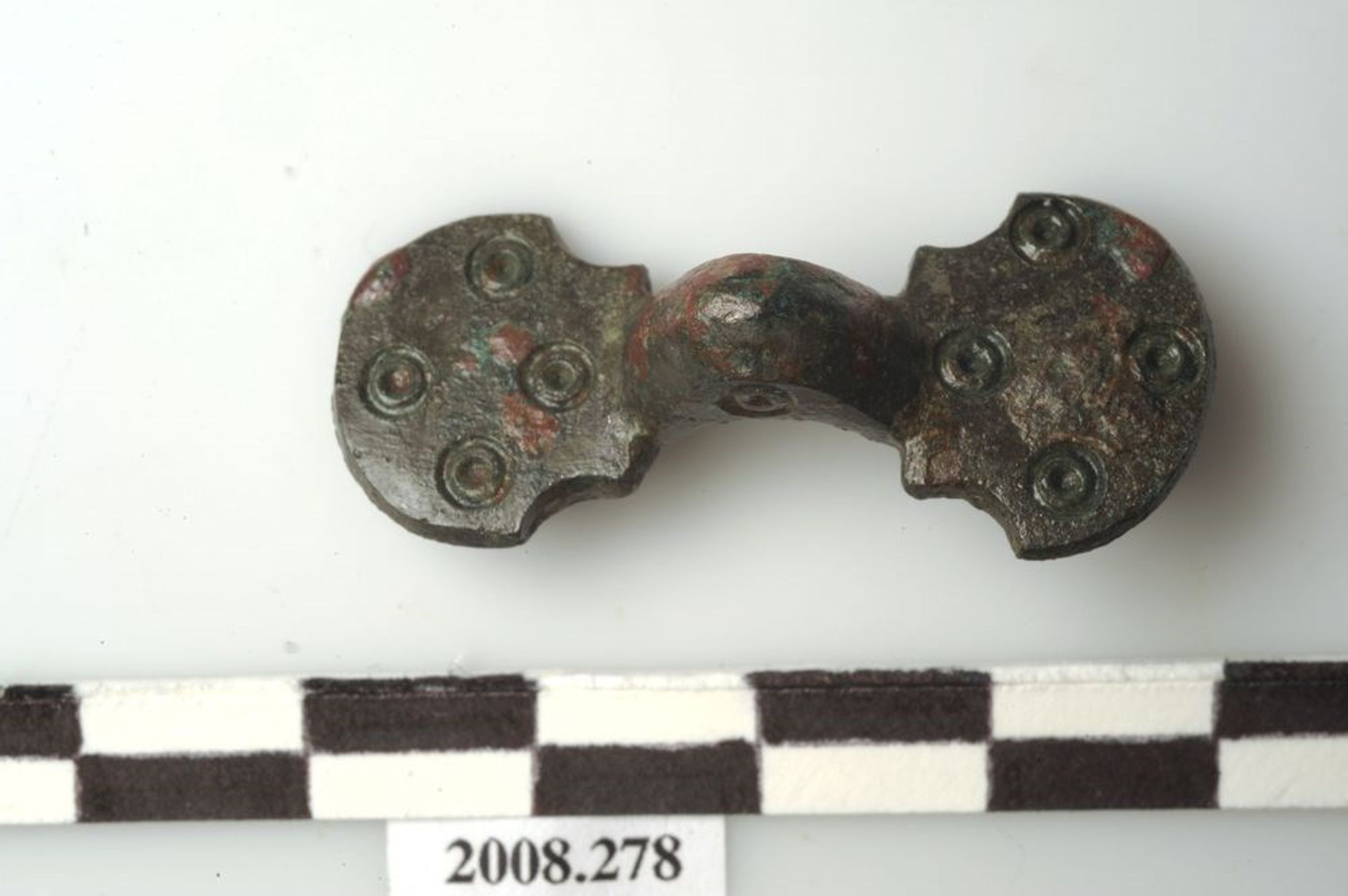 Au revers, le système de fermeture est incomplet : de la charnière ne subsiste que la petite patte dans laquelle passe l'axe en fer; dans la continuité de ce dernier apparaît un élément en fer formant une demi-boucle et que l'on associe difficilement avec la charnière (pourrait-il s'agir d'un fragment de chaînette reliant deux fibules?). Le porte-ardillon est incomplet.