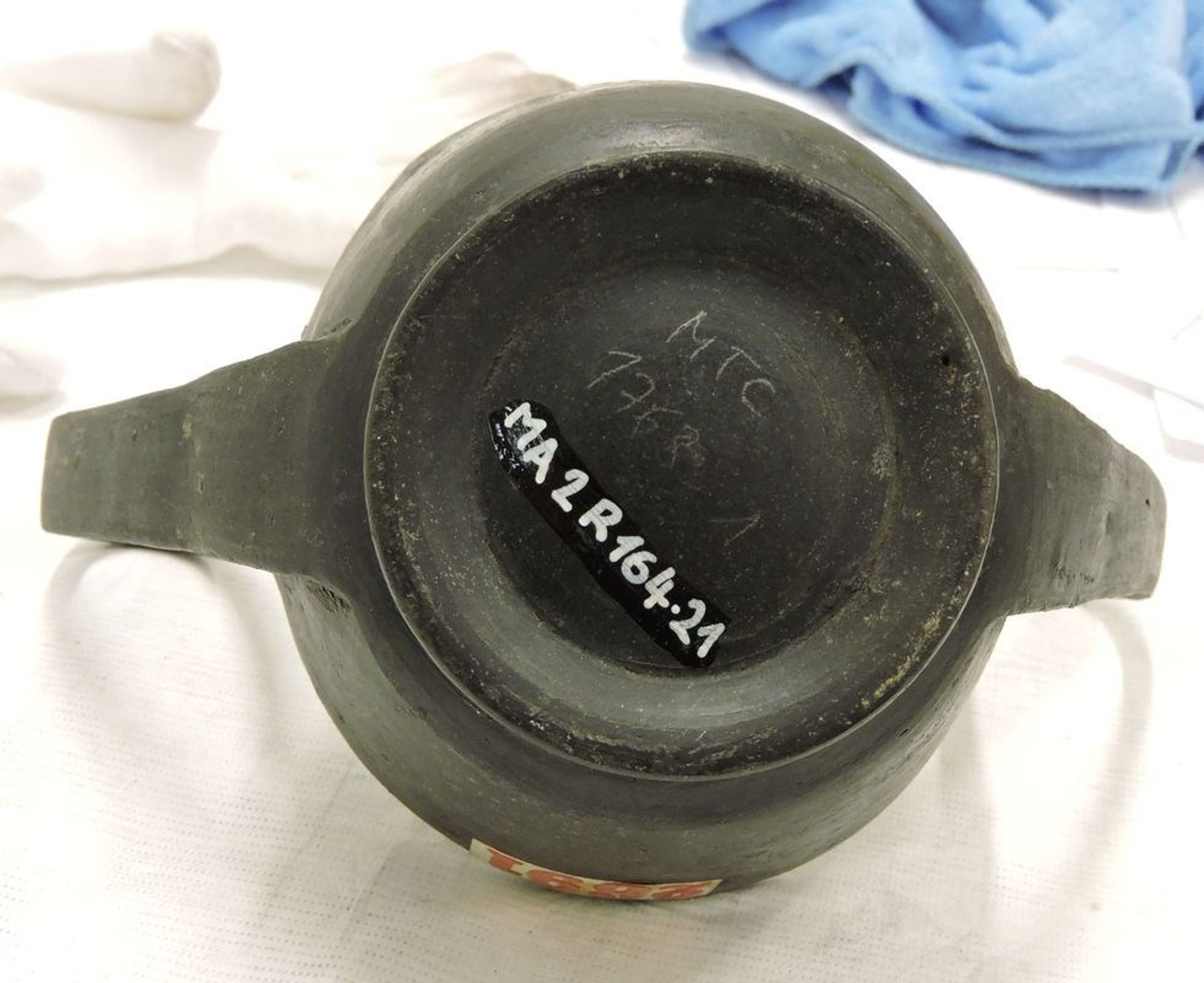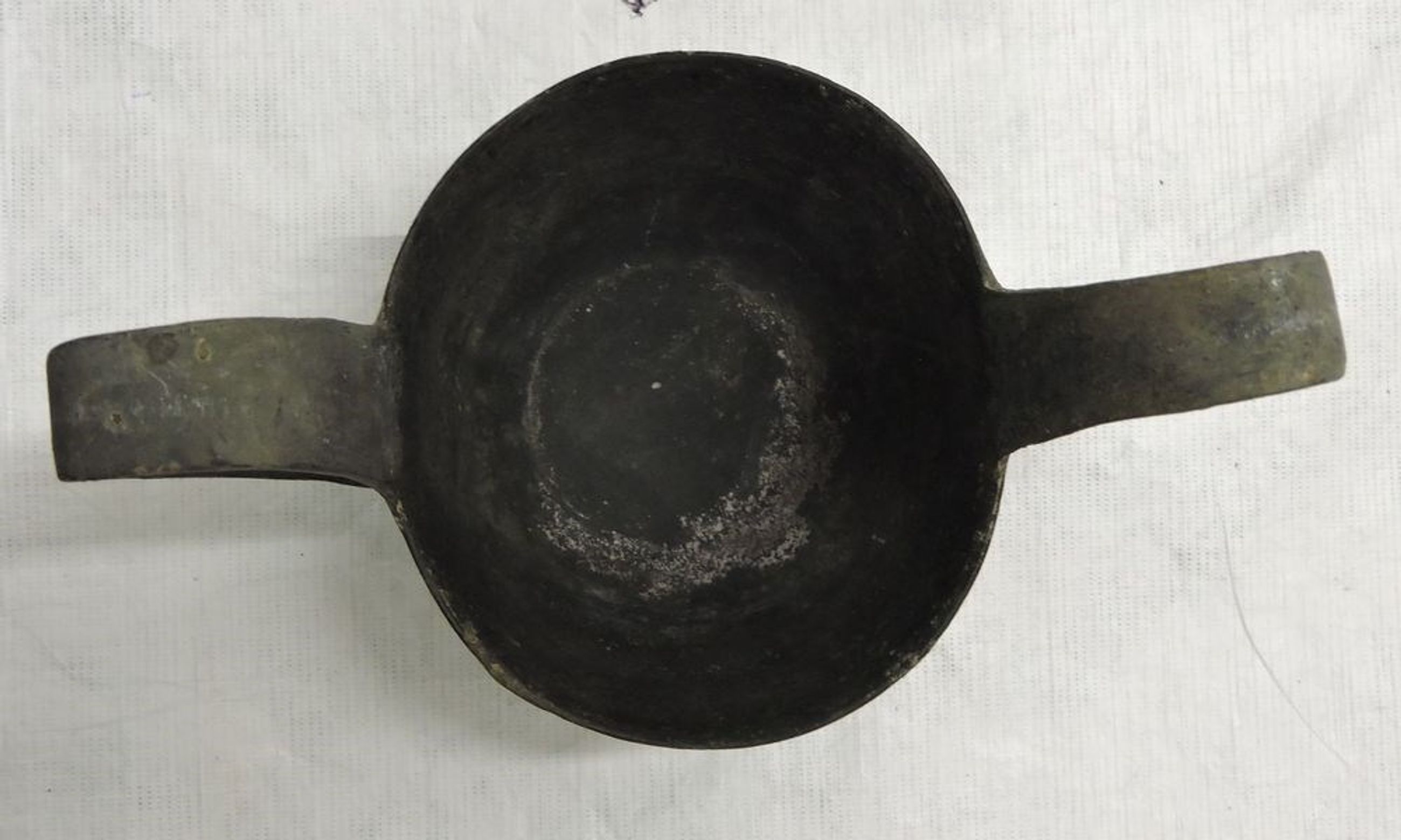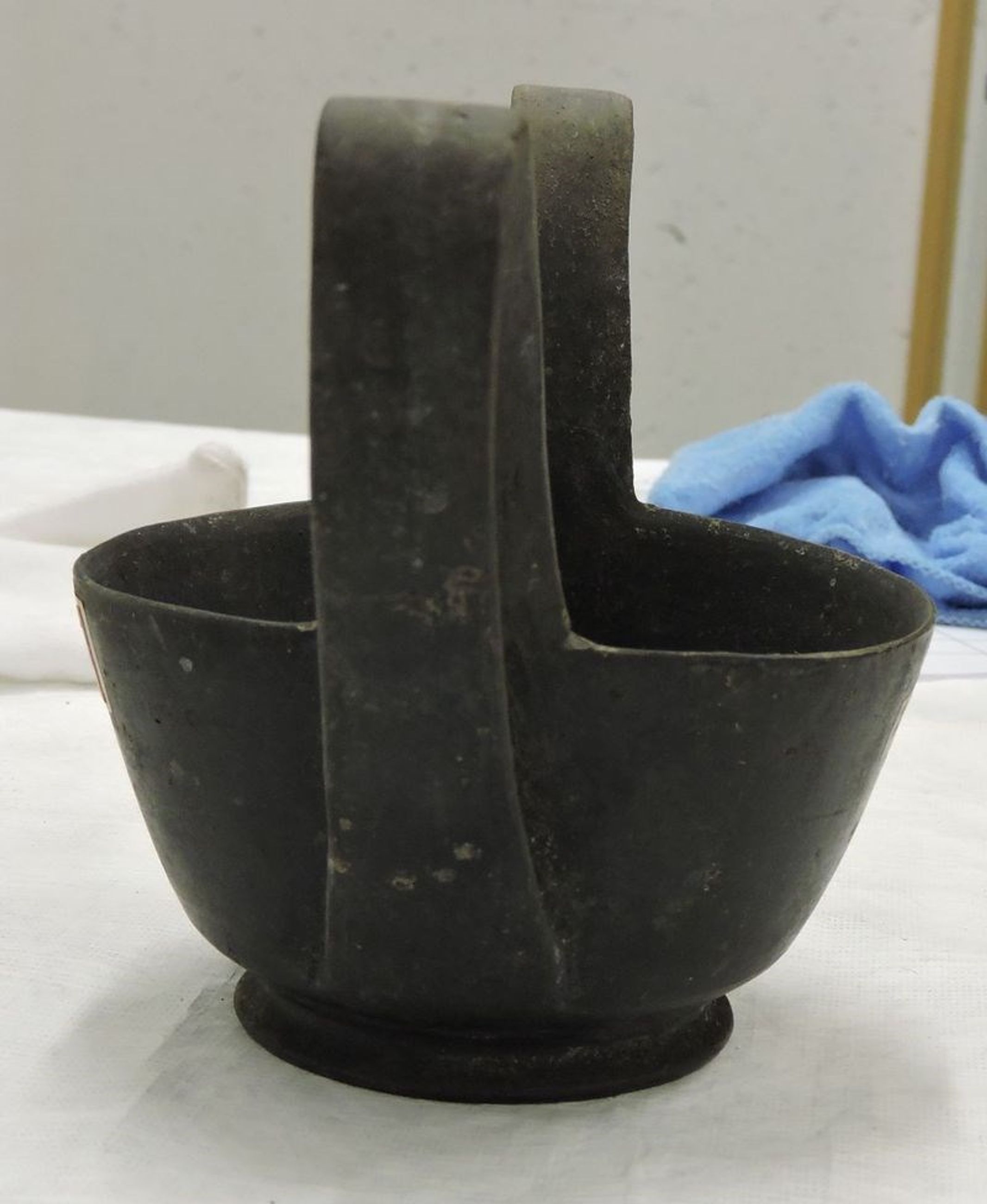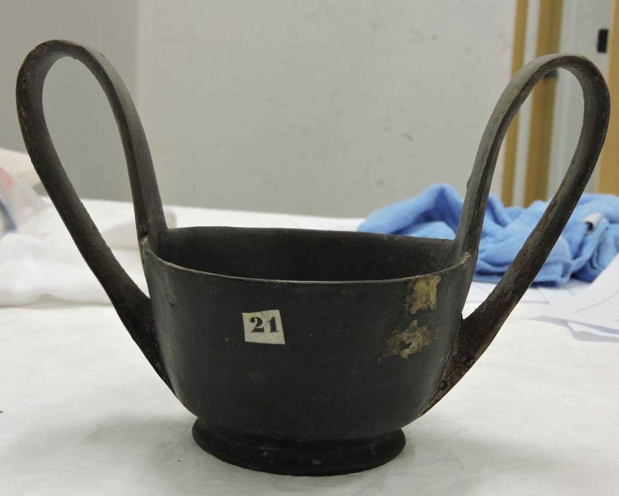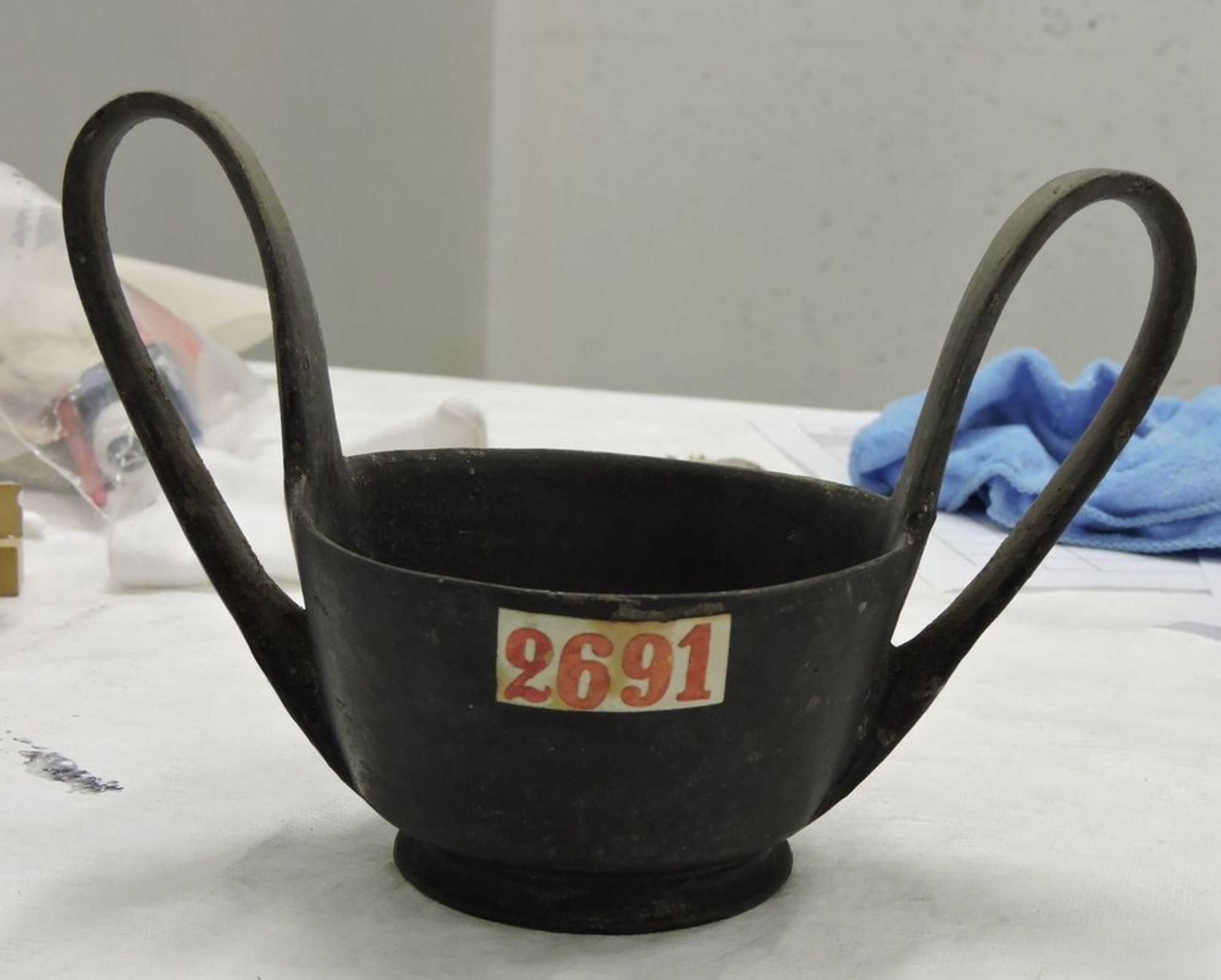 "Canthare à anses hautes, en ruban, plus larges au niveau de l'attache inférieure ; vasque profonde et carénée, à paroi épaisse ; pied bas annulaire. Sans décor." (description du Louvre, récolement 2004)
