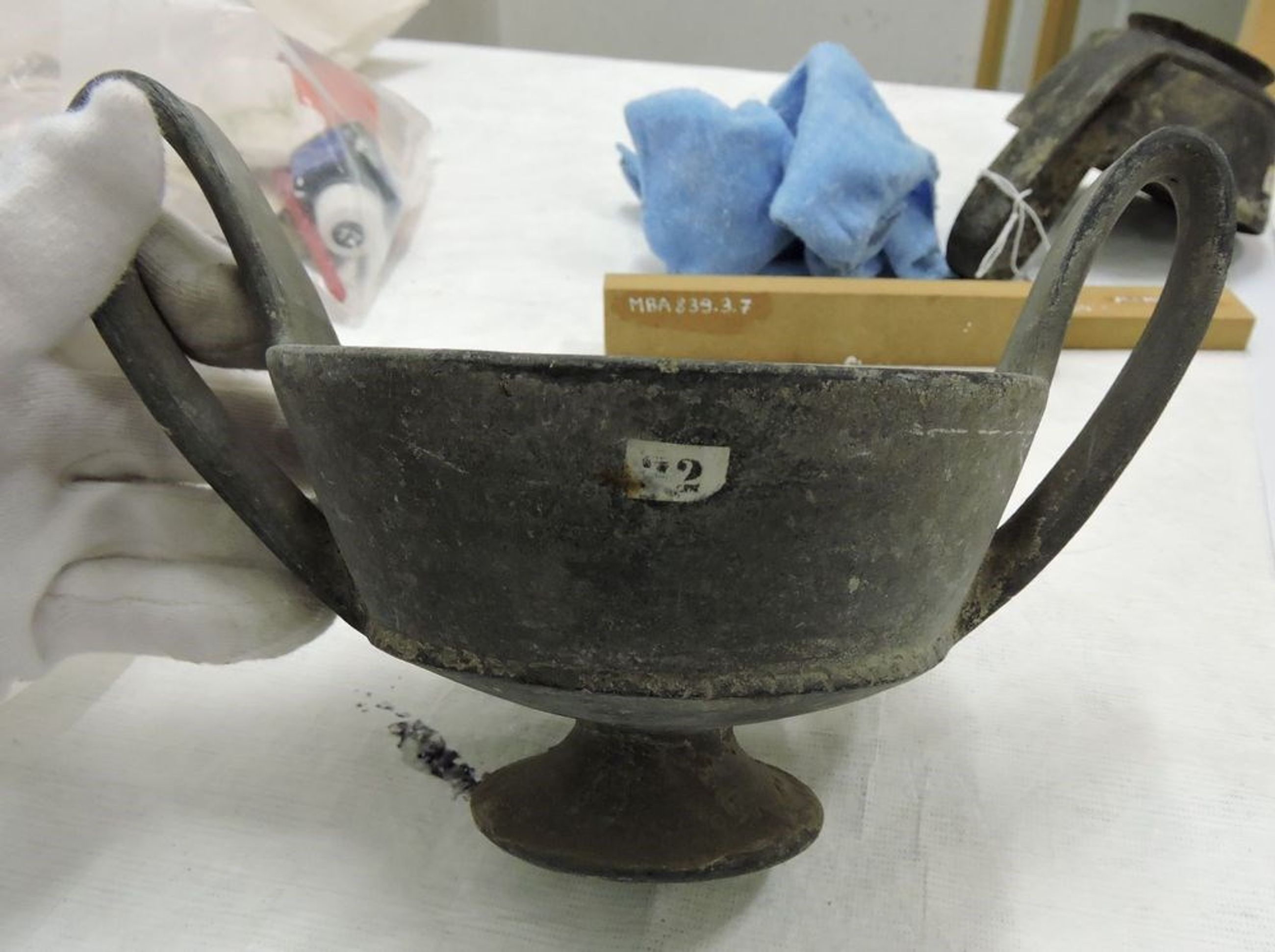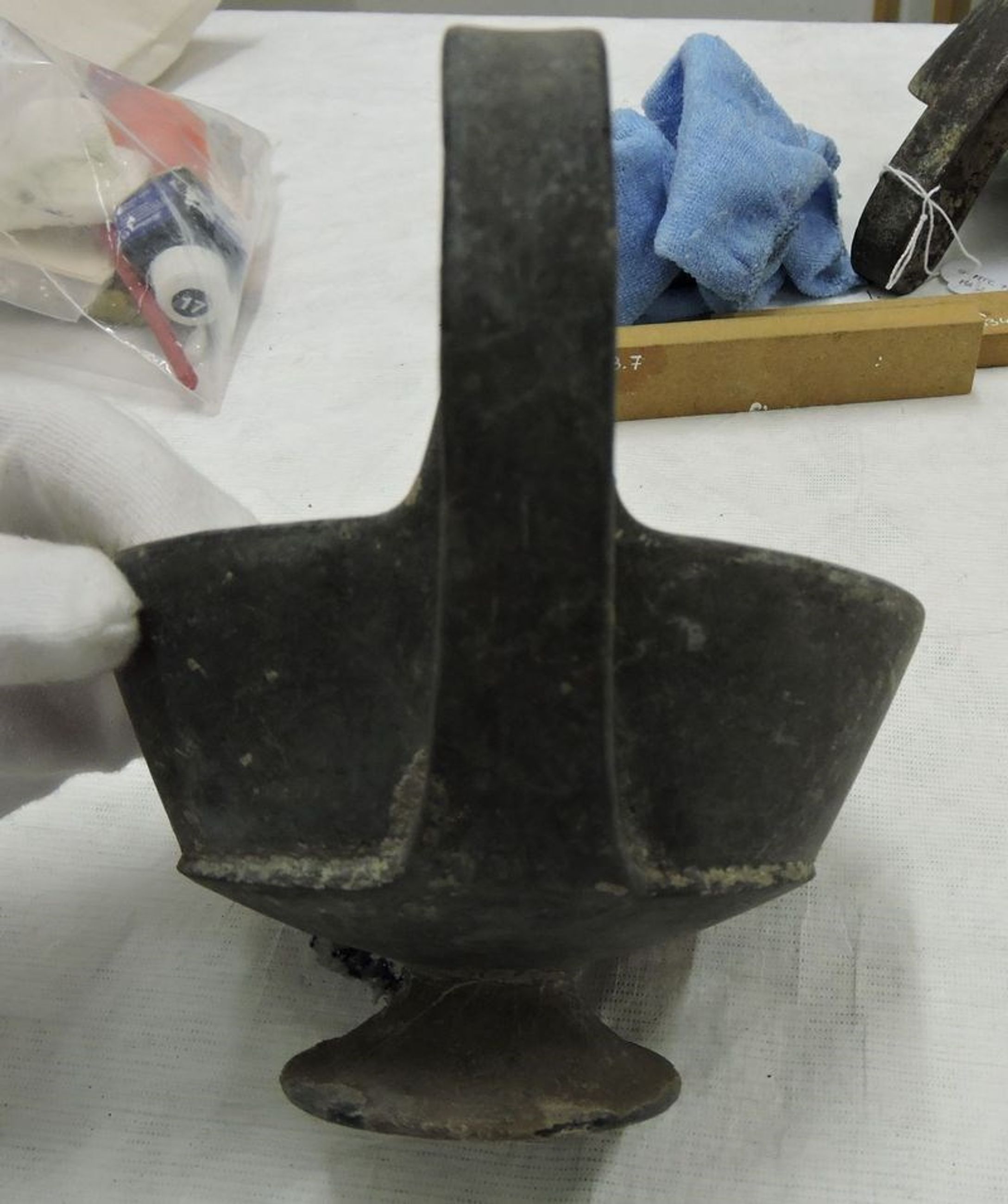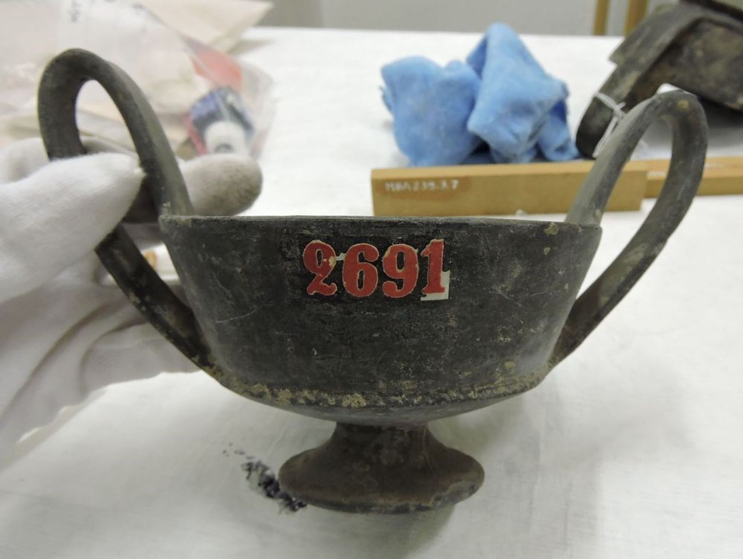 "Canthare à anses hautes, en ruban, plus larges au niveau de l'attache inférieure ; vasque profonde et carénée, à paroi épaisse ; pied haut en trompette. Décor à la roulette (encoches) sur la carène." (description du Louvre, récolement 2004)