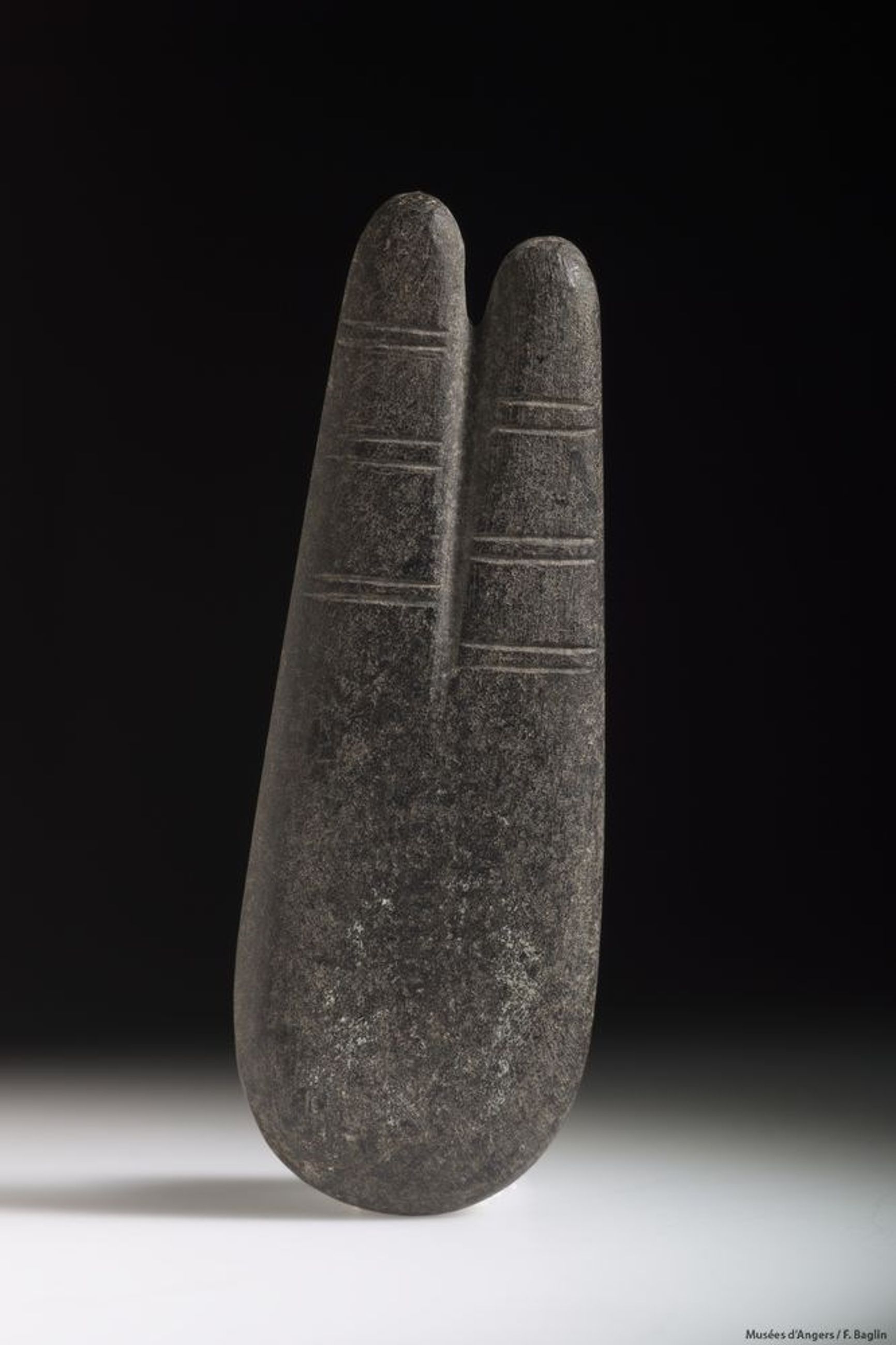 "Cette amulette figure deux doigts accolés, l'index et le majeur, avec la représentation des obles et des phalanges. Verso : représentation des plis des phalanges. A partir de la XXVIe dynastie, cette amulette est placée généralement au niveau de l'incision du flanc et paraît rappeler surtout par la matière l'instrument utilisé par les ambaumeurs pour procéder à l'éviscération" (Affholder-Gérard et Cornic, 1990)