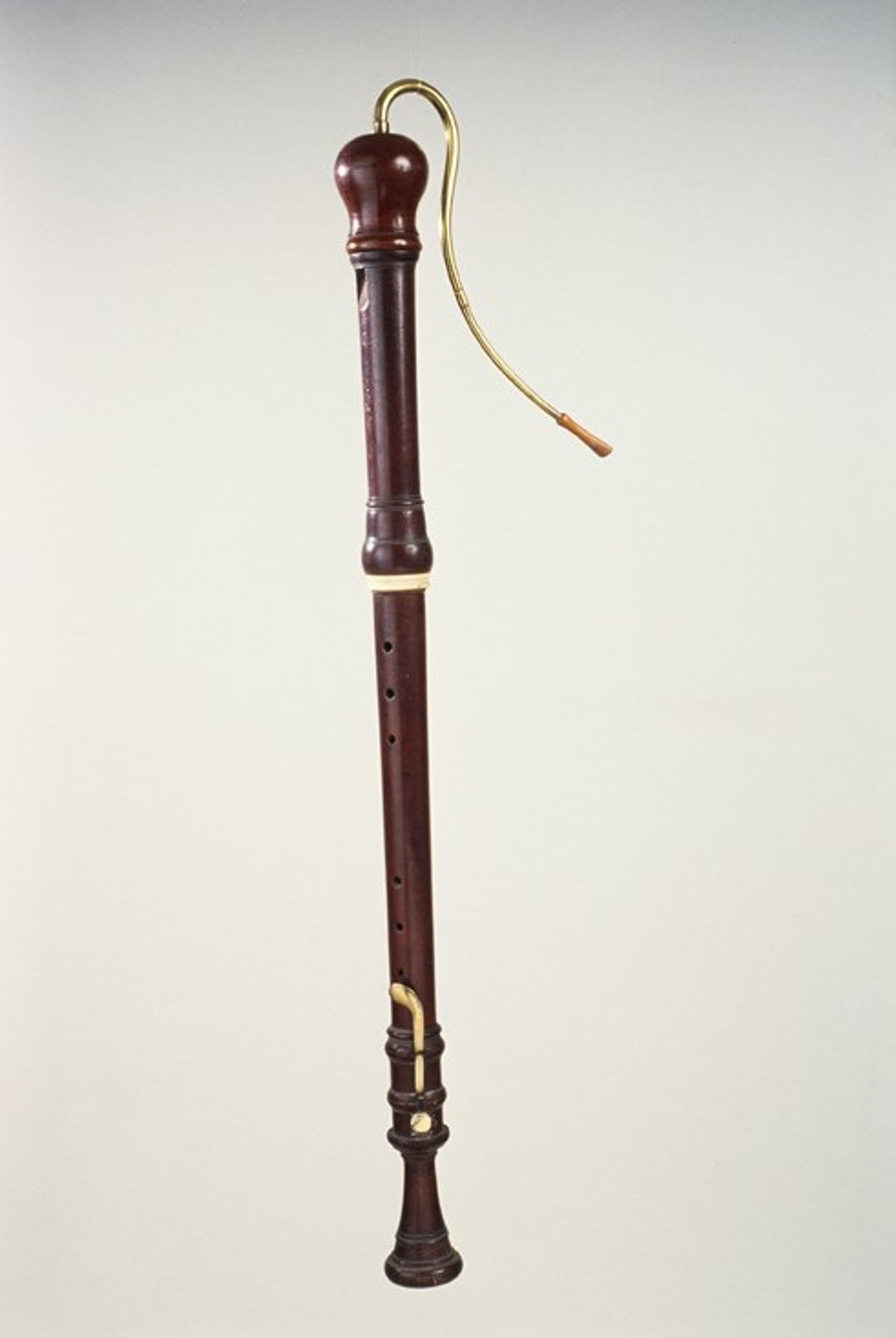 5 parties : cuivret fait de 2 pièces soudées en laiton, courbe et contre-courbe, terminé par un embout en buis tête de boule, corps du haut important. L'ensemble biseau-lumière, corps du bas pavillon. 7 trous de jeu ( 6 alignés + pouce), diamètres : 8-8-7/9-7-6.5 mm, les trous 1 et 4 étant percés vers le haut, les trous 3 et 6 vers le bas. Un clef ronde en laiton montée sur bloc.