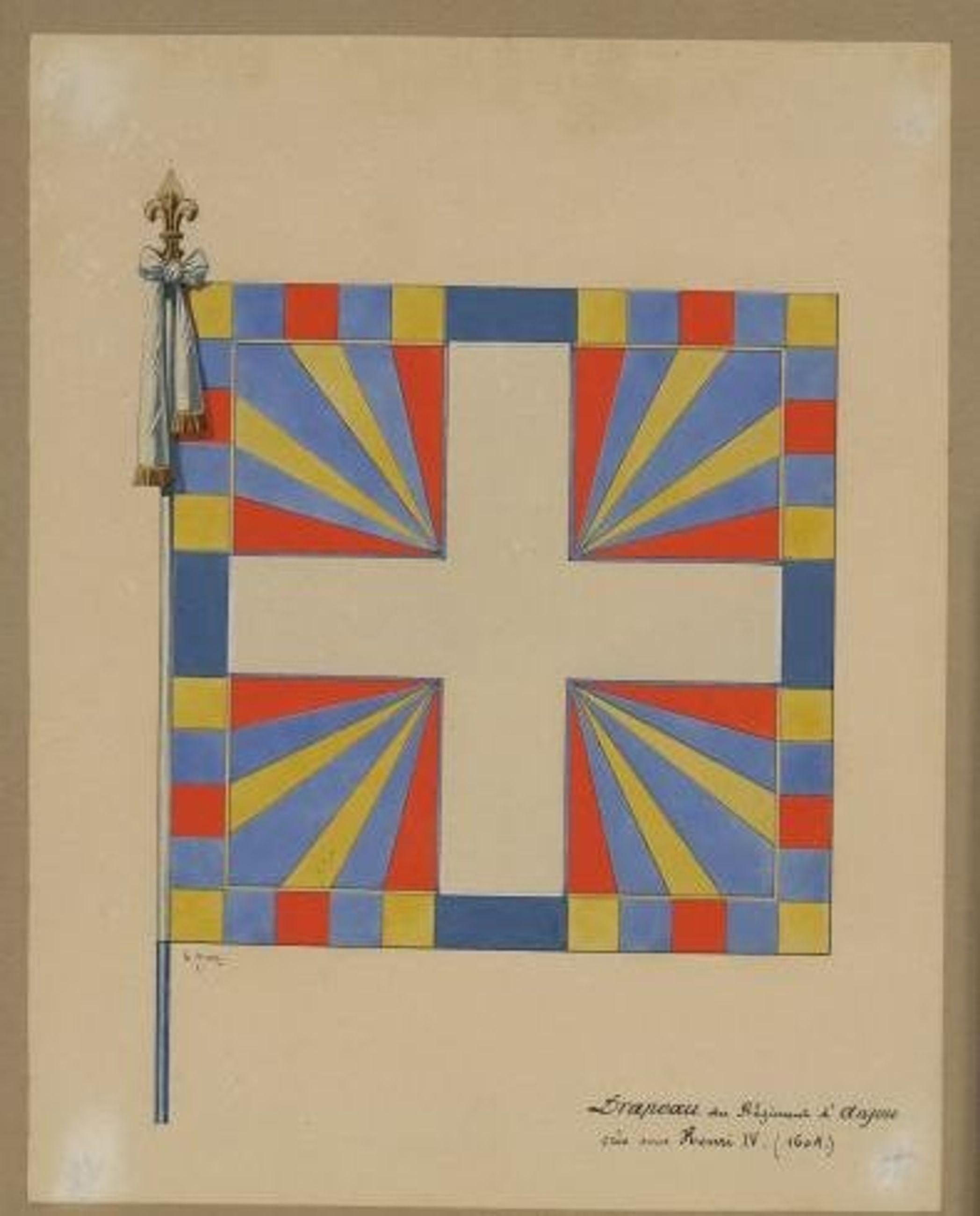"Drapeau du régiment d'Anjou créé sous Henri IV, 1604. Croix blanche cantonnée de rayons alternés rouge bleu noir jaune. Bordure avec carreaux de même couleur, hampe fleurdelysée, cravate blanche, franges d'or" (cf registre des entrées)