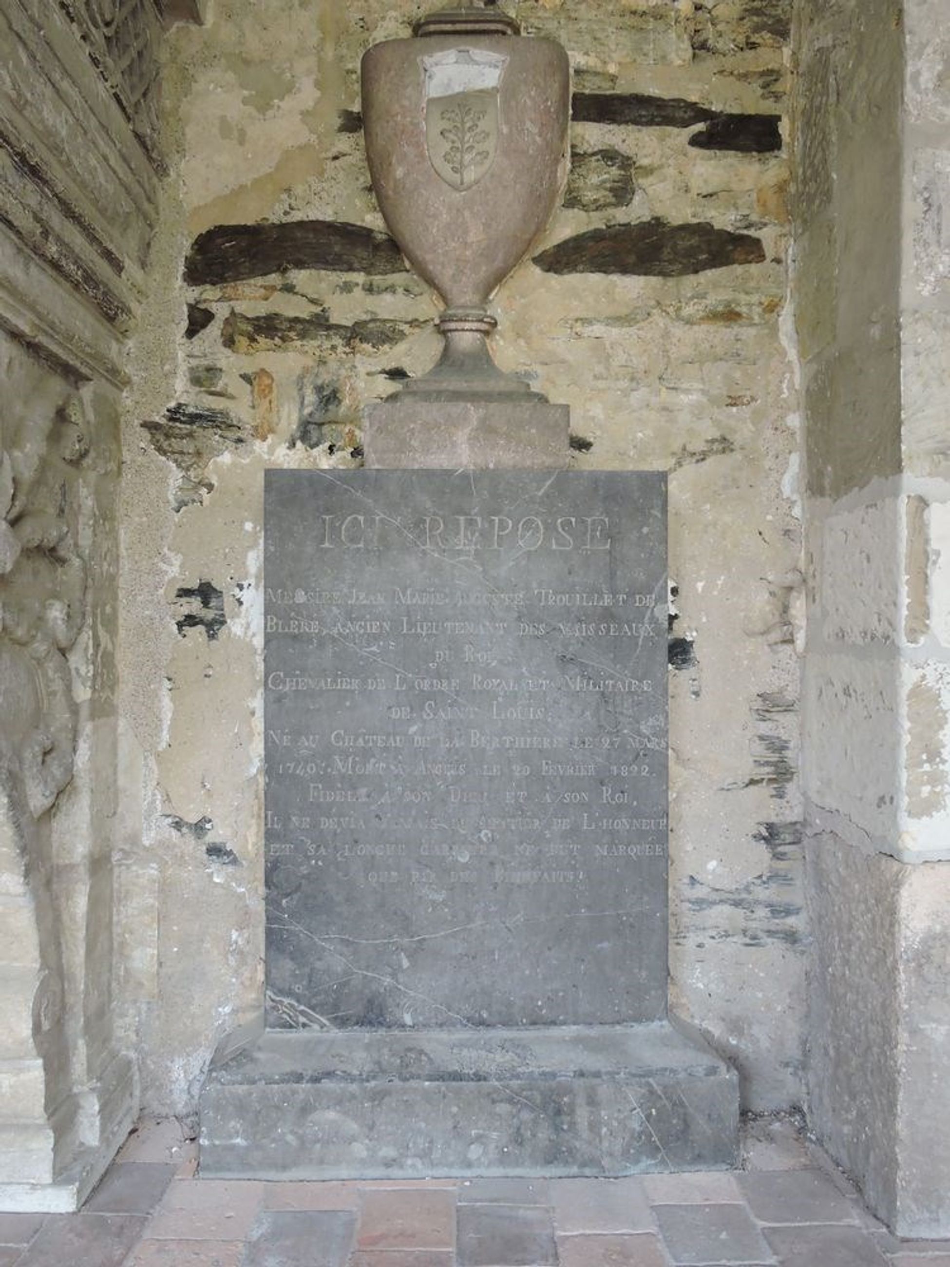 ; "ICI REPOSE // MESSIRE JEAN AUGUSTE TROUILLET DE BLERE, ANCIEN LIEUTENANT DES VAISSEAUX //