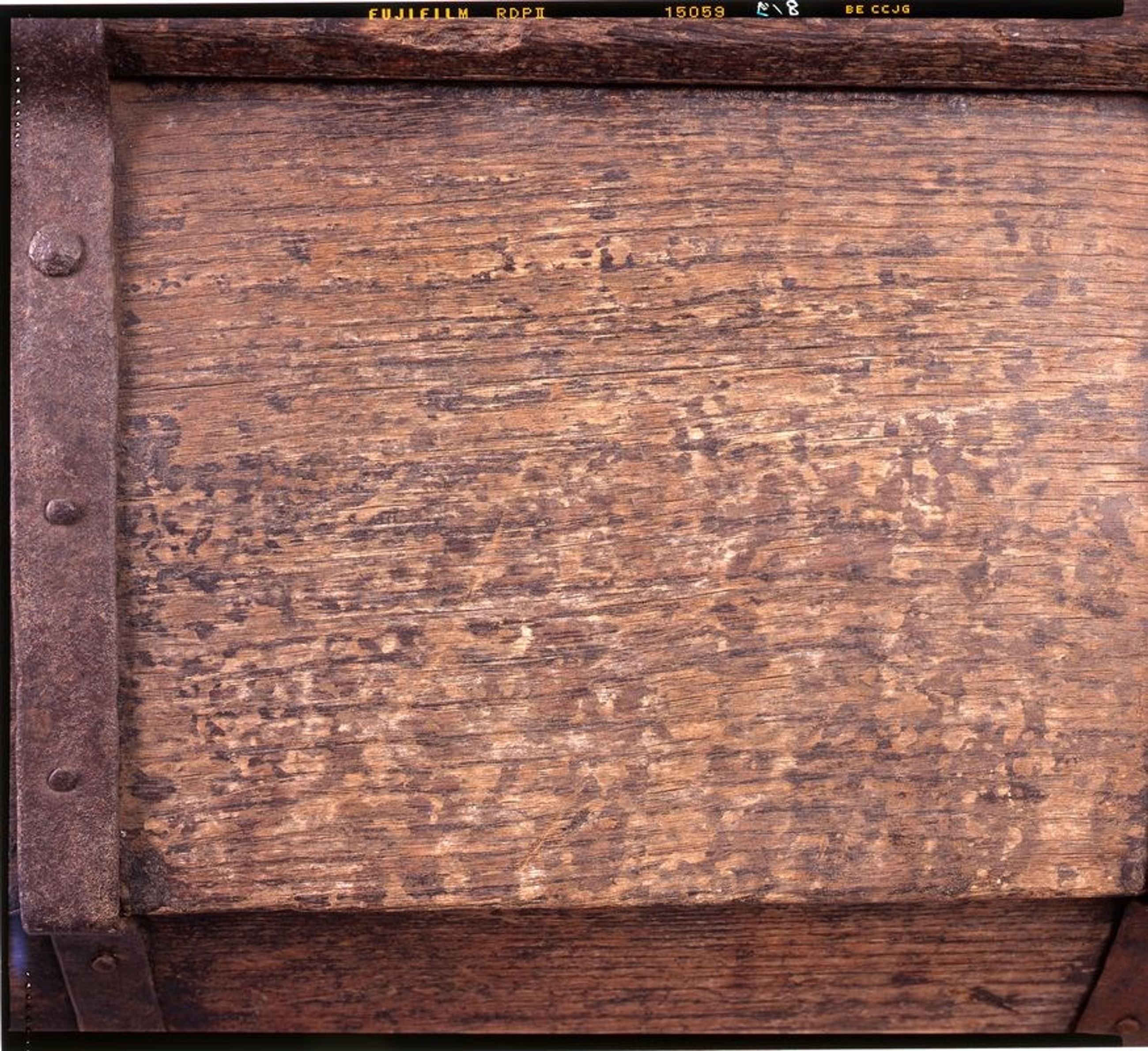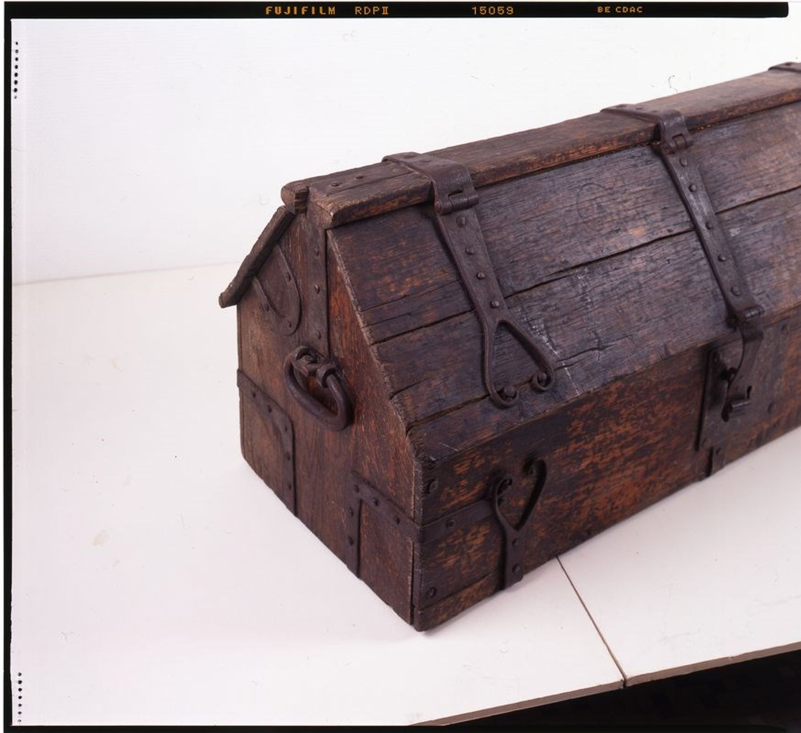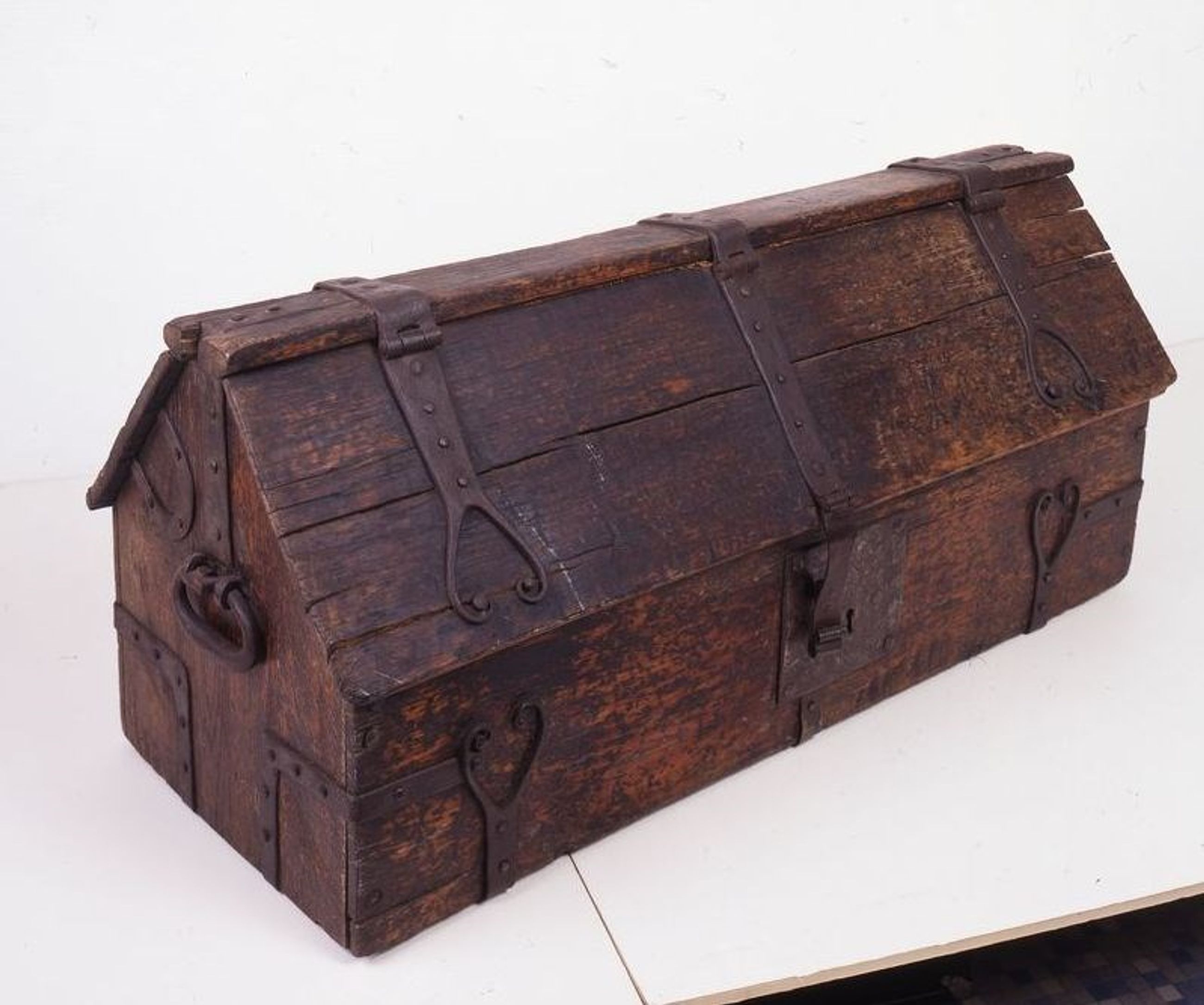 Coffre de marinier de Loire en bois, cerclé de fers, à décor de ferronnerie en forme de coeur. Intérieur doublé d'un tissu blanc et bleu.