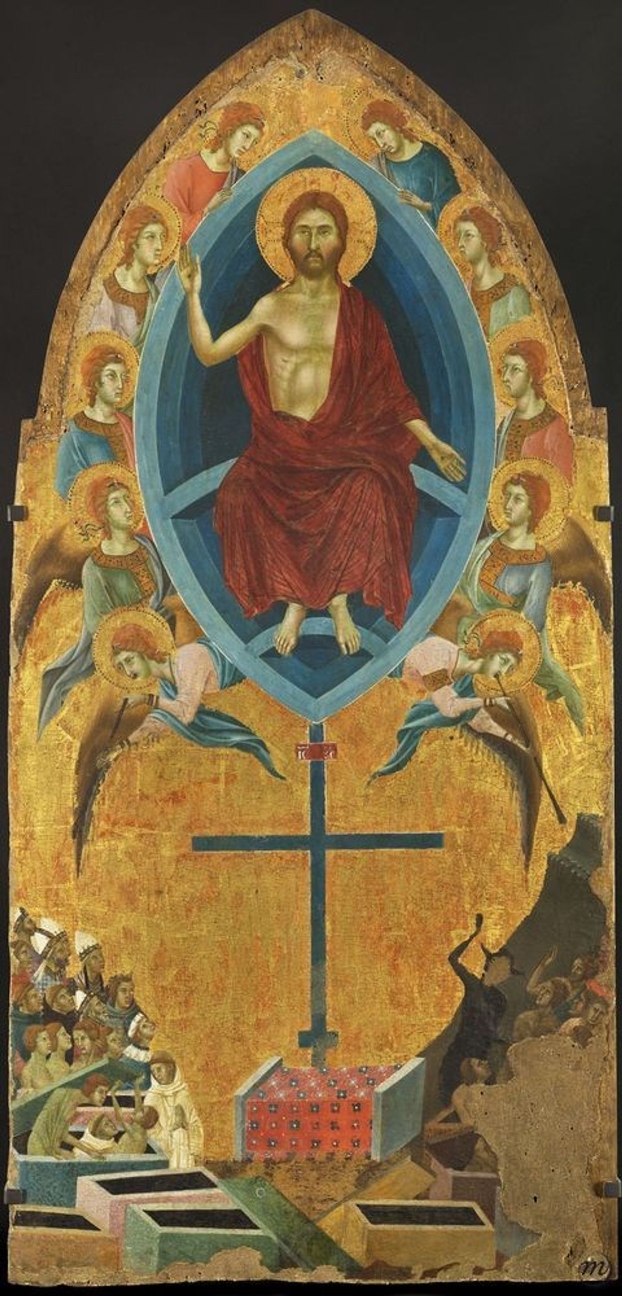 Trônant en majesté dans une mandorle d’azur céleste qu’escortent dix anges, le Christ sépare l’humanité. De la droite, il bénit le groupe des élus et leur désigne le Paradis comme dernière demeure. De la gauche abaissée, il condamne les méchants, aiguillonnés par un diable, à la damnation éternelle en Enfer. Si la frontalité quelque peu hiératique de la figure du Christ et l’adoption d’un fond d’or se rattachent encore à la tradition byzantine, la recherche de naturel dans les attitudes et d’une certaine profondeur spatiale dans la composition ouvrent sur les évolutions les plus novatrices de la peinture à l’aube du 14e siècle. (A. James-Sarazin)