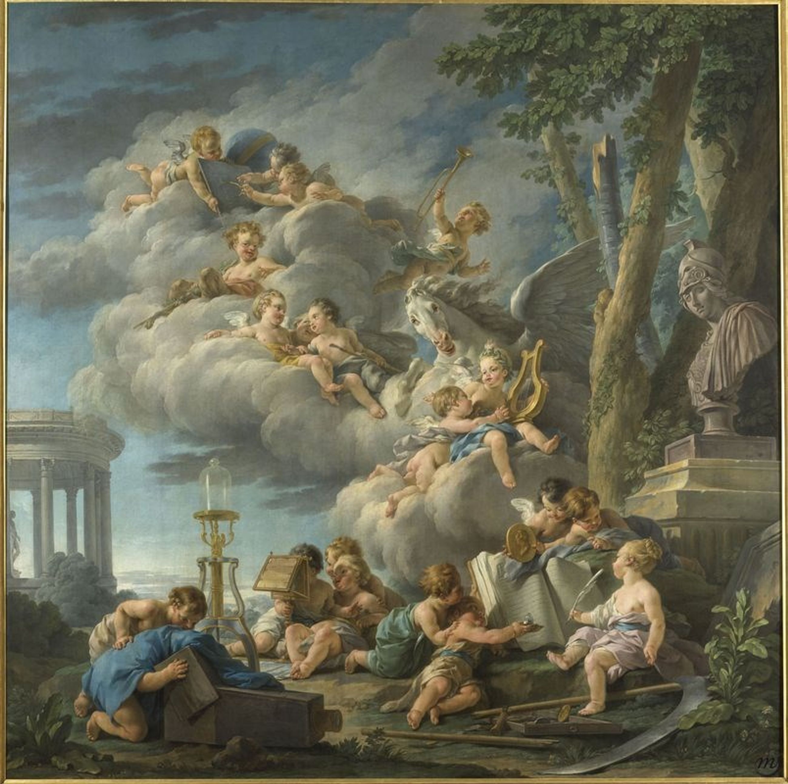 Cette peinture, de même format que Les Génies des arts, est conçue comme son pendant. Elle figure les génies de l’astronomie, illustrée par le globe et le compas, de la poésie, symbolisée par la lyre et le cheval Pégase, de l’histoire, matérialisée par la rédaction du livre, et de la physique, évoquée par la pompe à vide et la camera obscura. La composition de Noël Hallé est plus aérée que celle de François Boucher, le traitement des putti plus sage, les tons plus soutenus. Ces caractéristiques infléchissent le style de l’oeuvre vers une manière plus académique.