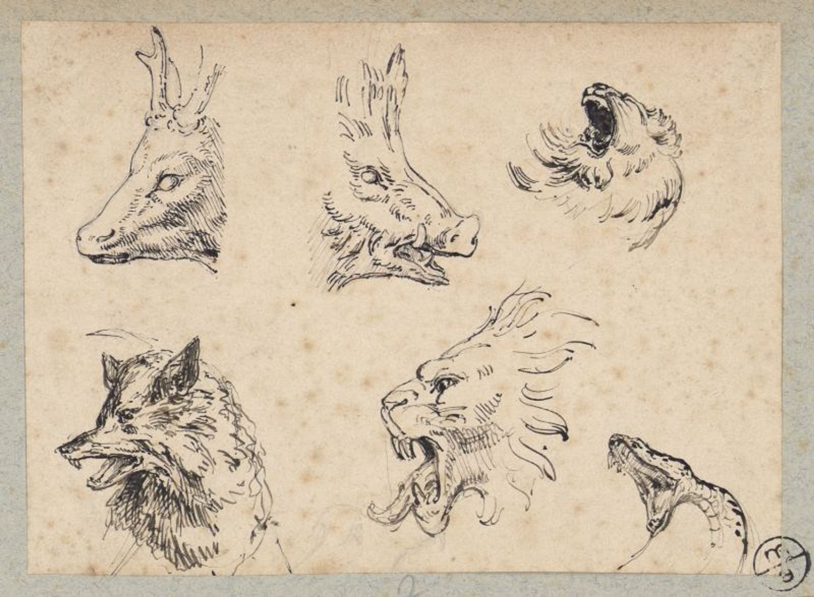 Six études de têtes d'animaux : un cervidé, un sanglier bouche ouverte, deux lions rugissant, un renard montrant les crocs et un serpent mâchoires ouvertes.