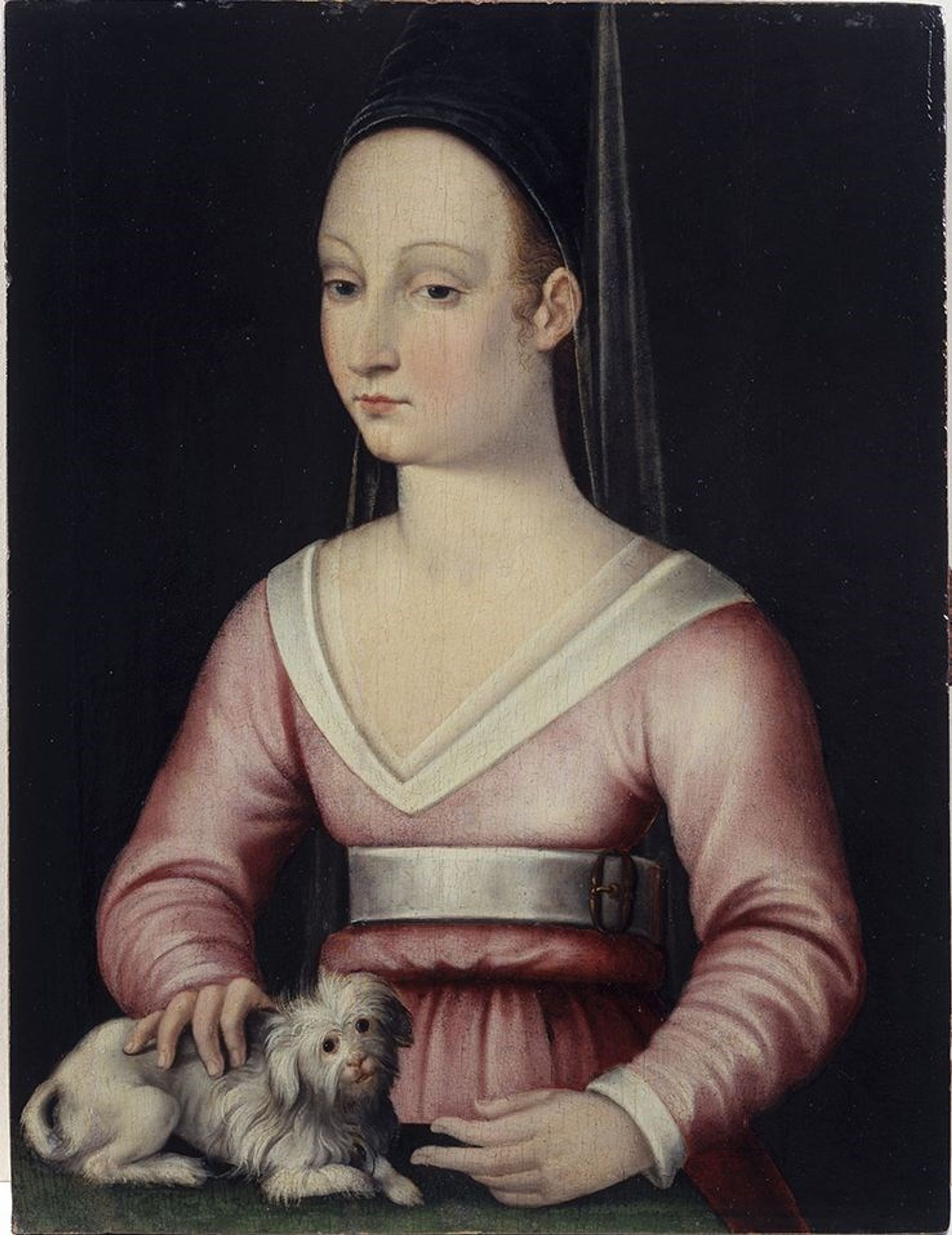 Portrait de femme tournée de trois quart à gauche, portant un hennin et un corsage échancré en pointe. La robe est retenue à la taille par une large ceinture. Elle caresse un petit chien blanc.