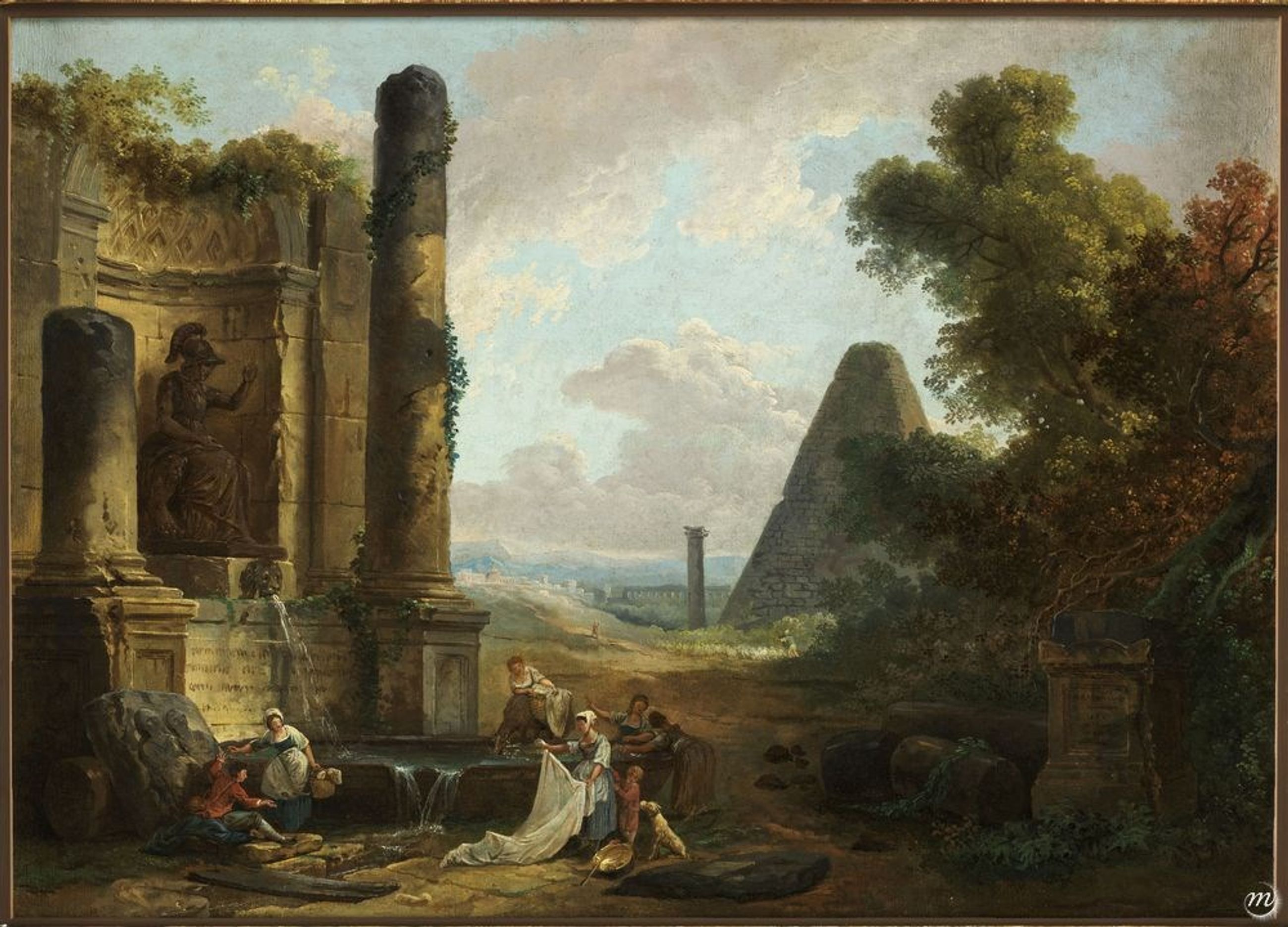 Ce paysage a été réalisé par l’artiste quelques années après son retour de Rome. Malgré le titre donné au 18e siècle, les monuments représentés, par leur agencement et leur aspect, ne se réfèrent pas précisément à la réalité. Il s’agit plutôt d’un « collage » d’éléments réinterprétés. Les pierres érodées, couvertes de végétation, ainsi que les personnages populaires croqués dans leur labeur quotidien évoquent le pouvoir de destruction et d’oubli du temps qui passe. La facture de l’oeuvre témoigne d’un métier accompli, fondé sur l’harmonie chromatique et sur une touche fluide.