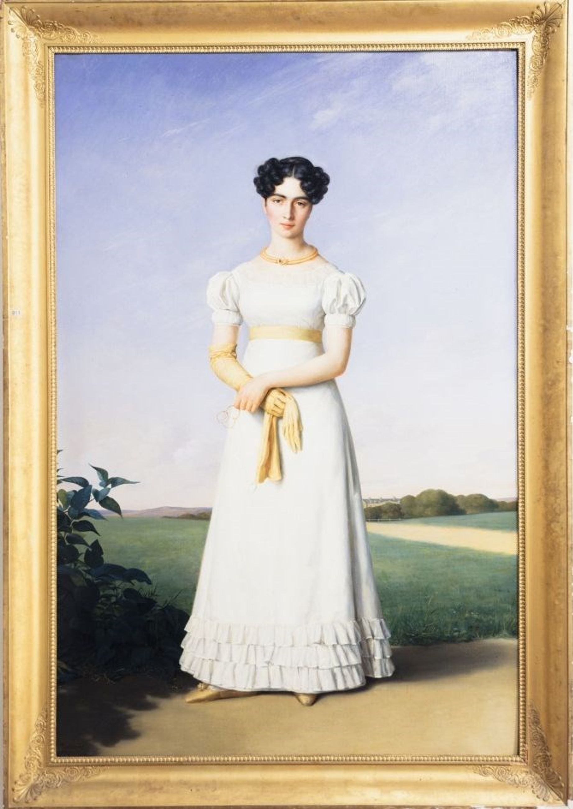 En pied, debout, robe blanche ; une main gantée, dans l'autre un lorgnon. Fond de ciel.