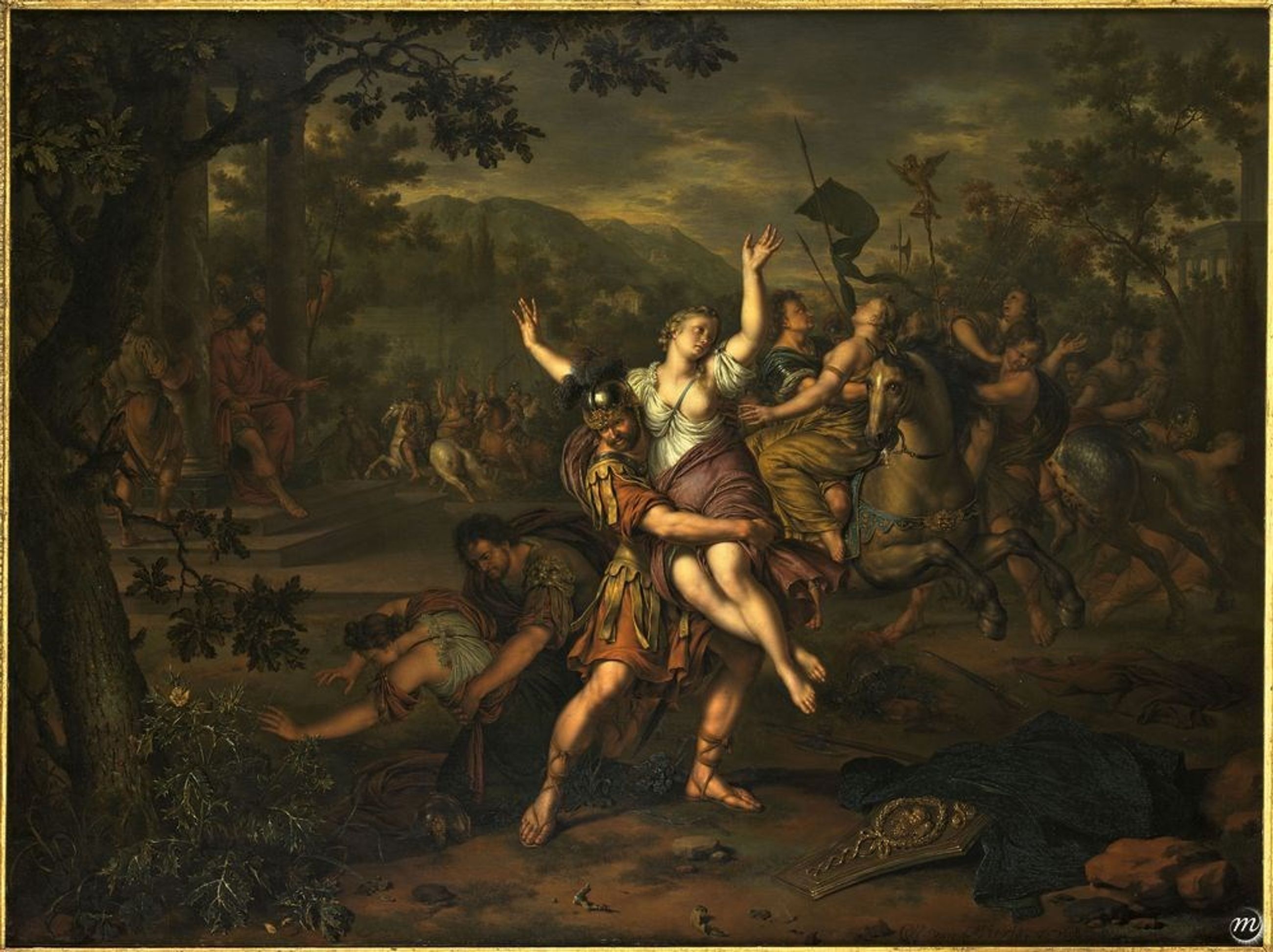 Un Romain emporte une Sabine demi-vêtue qui se débat dans ses bras ; à gauche, un autre Romain s'efforce de soulever une fmme qui s'esrt laissé tomber sur ses genoux ; à droite Romains et Sabines en lutte Romulus, debout sur un tertre, contemple cette scène ; cavaliers en marche au second plan.