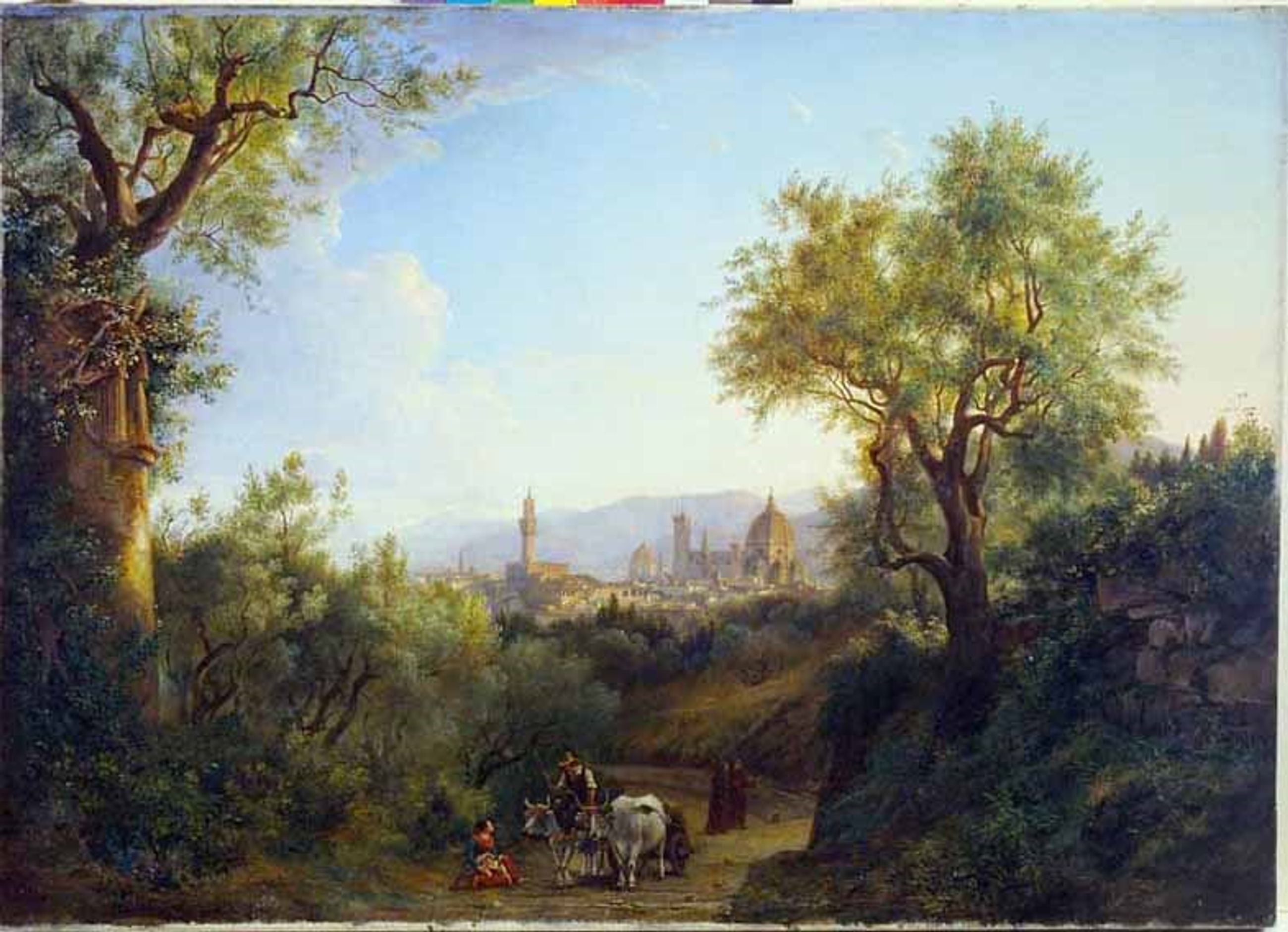 Au premier plan deux boeufs traînent une charette, de droite à gauche. Ils sont arrêtés, et le conducteur, assis sur le joug, tenant un aiguillo,, cause avec une femme assise à terre, devant lui, ayant un enfant sur ses genoux. Deux Capucins causent en s'éloignant de ce groupe vers la droite. De chaque côté de la composition est un arbre à forte ramure. Au deuxième plan on aperçoit la ville de florence à demi cachée par des bouquets d'arbres.