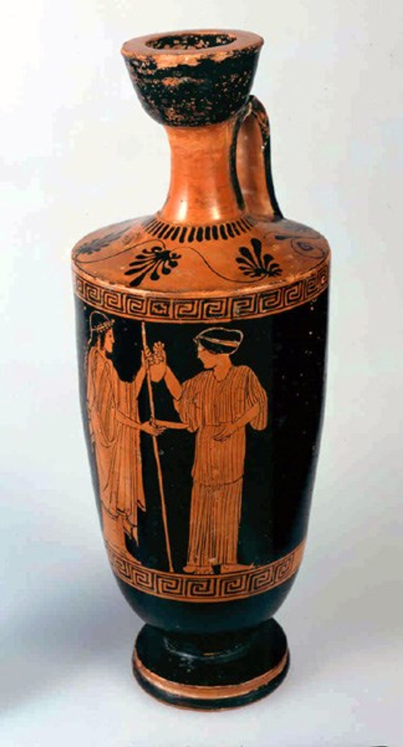 La scène se situe à l'opposé de l'anse du lécythe. Les deux personnages occupent la hauteur maximale entre deux grecques. A droite une femme debout de trois quart vers la gauche, tient de la main droite levée une oenochoé pour offrir une libation en l'honneur du personnage richement vêtu qui lui fait face. Celui-ci s'appuie sur un haut bâton qui détermine l'axe de symétrie. De sa main droite il tient une philae sous l'oenochoé.