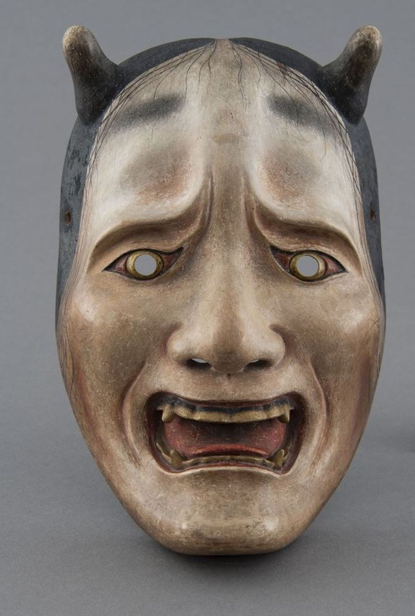 "Utilisé dans les pièces de théâtre nô, ce masque est en bois peint. Il représente le personnage Hannya, une femme-serpent devenue démon par haine et jalousie. Sculpté avec minutie, son expression est telle qu’elle varie selon l’éclairage et l’inclinaison de la tête. Ainsi, sa fureur vue de face laisse place à plus de tristesse lorsque le masque s’incline." (F. Rubiella, 2020)