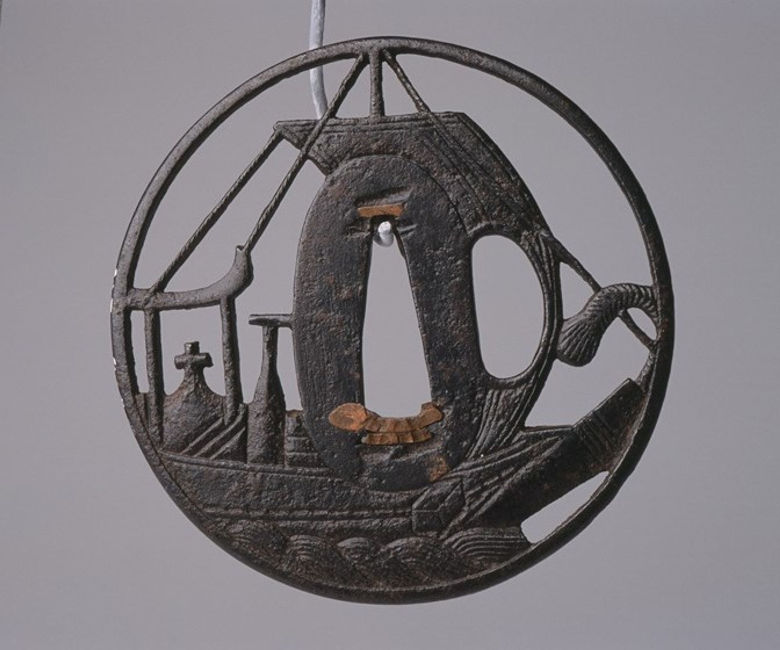 Tsuba en fer, ronde, décorée en ajour positif d'un navire occidental portant une croix.